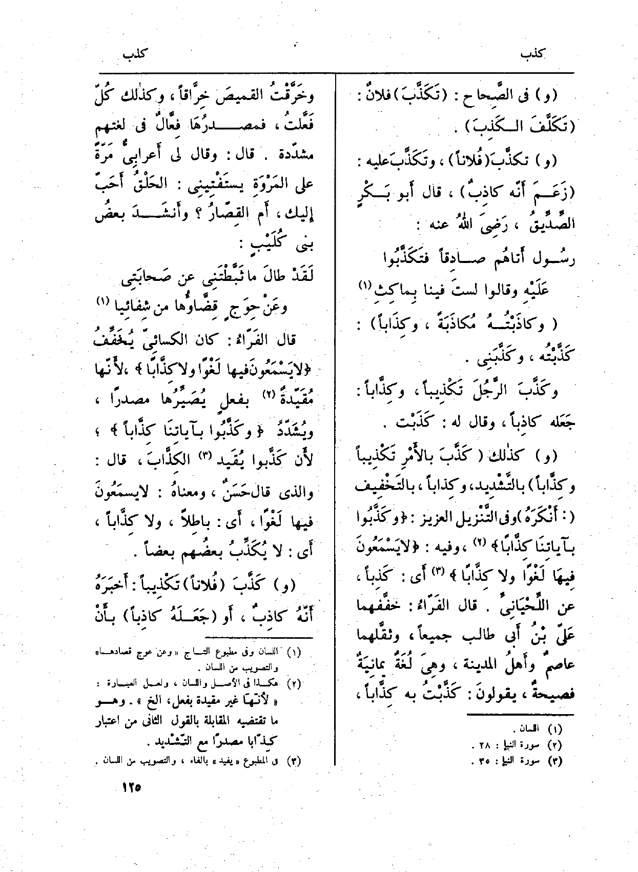 قَالَ الفَرّاءُ: كَانَ الكِسائِيّ يُخَفِّفُ {لاَّ يَسْمَعُونَ فِيهَا لَغْواً وَلاَ كِذباً} ، لأَنّها مُقَيّدةٌ بفعلٍ يُصَيِّرُها مصدرا، ويُشَدّدُ {4. 010 وكذبوا بِآيَاتِنَا كذابا} ؛ لأَن كَذَّبوا يُقَيد الكِذَّابَ، قَالَ: وَالَّذِي قَالَ حَسَنٌ، ومعناهُ: لَا يسمَعُونَ فِيهَا لَغْواً، أَي: باطِلاً، وَلَا كِذَّاباً، أَي: لَا يُكَذِّبُ بعضُهم بَعْضًا.