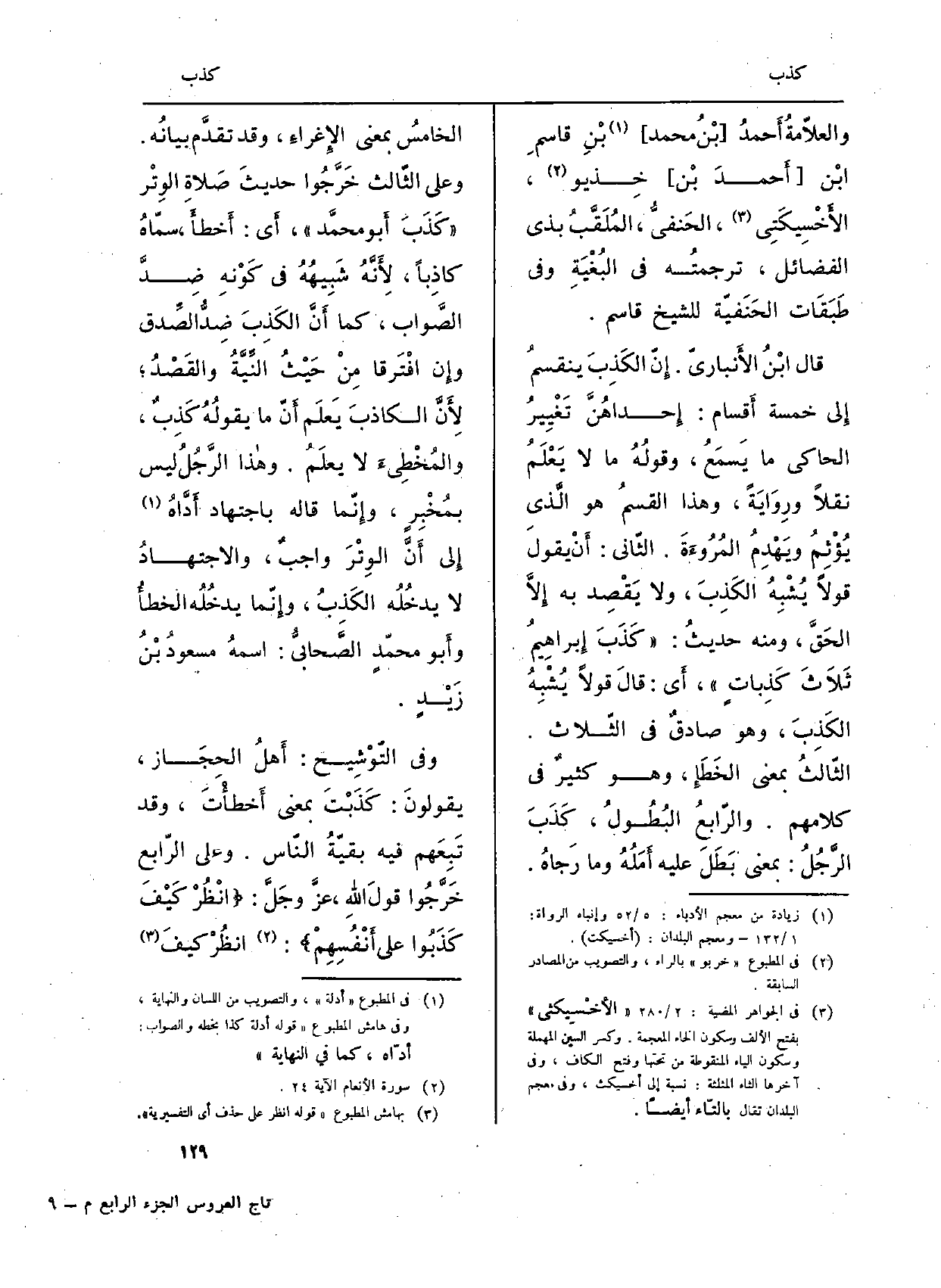 وَفِي التَّوْشِيح: أَهلُ الحِجَاز، يقولونَ: كَذَبْتَ بِمَعْنى أَخطأْتَ، وَقد تَبِعَهم فِيهِ بقيّةُ النّاس. وعَلى الرّابع خَرَّجُوا قولَ اللَّهِ عزَّ وجلَّ: {انظُرْ كَيْفَ كَذَبُواْ عَلَى أَنفُسِهِمْ} (الْأَنْعَام: 24) ، انظُرْ كيفَ