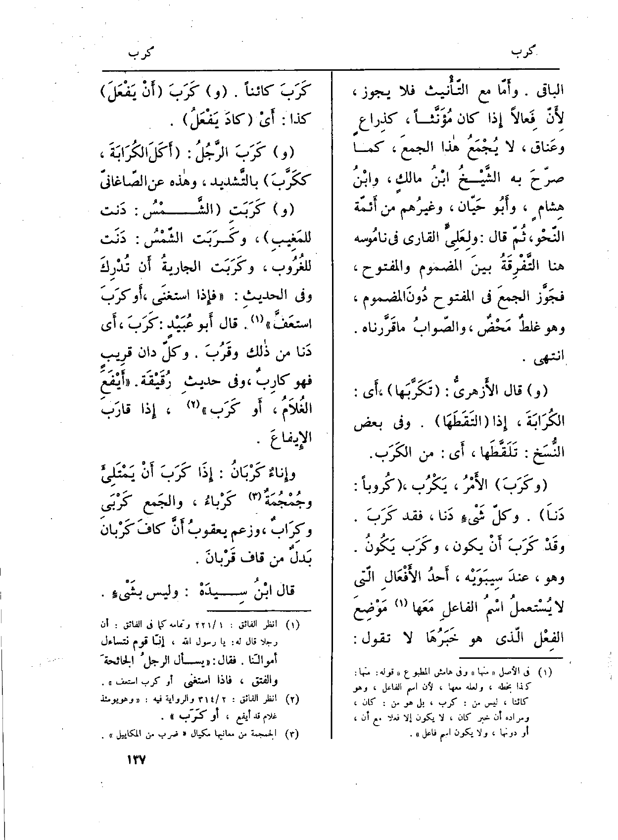 وإِناءٌ كَرْبَانُ: إِذَا كَرَبَ أَنْ يَمْتَلِىءَ وجُمْجُمَةٌ كَرْباءُ، والجَمع كَرْبَى وكِرَابٌ، وَزعم يعقوبُ أَنَّ كافَ كَرْبانَ بَدلٌ من قَاف قَرْبانَ.