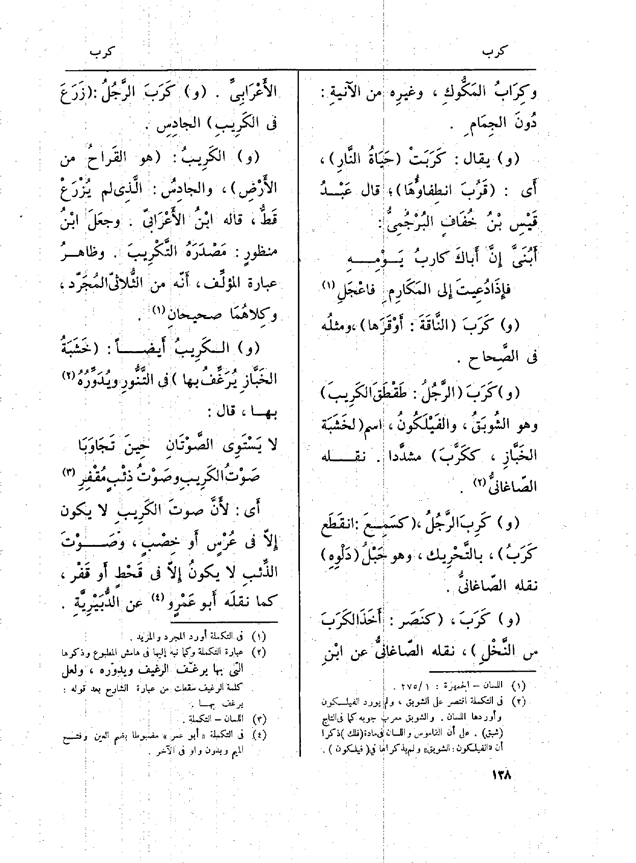 (و) كَرَبَ (الرَّجُلُ: طَقْطَقَ الكَرِيبَ) وَهُوَ الشُوبَقُ، والفَيْلَكُونِ، اسْم (لخَشَبَة الخَبَّازِ، ككَرَّبَ) مشدَّداً. نَقله الصّاغانيُّ.
