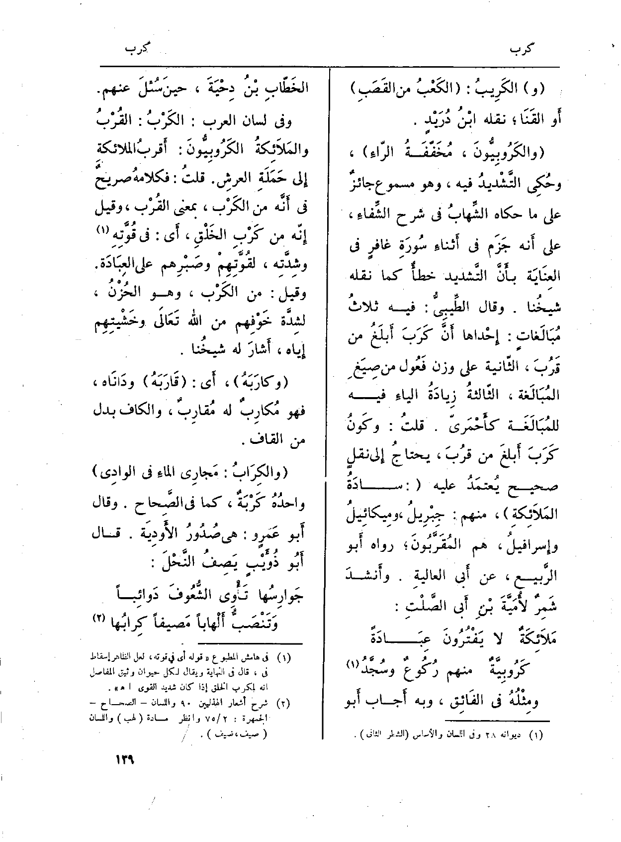 وَفِي لِسَان الْعَرَب: الكَرْبُ: القُرْبُ والمَلائِكةُ الكَرُوبِيُّونَ: أَقربُ الملائكةِ إِلى حَمَلَةِ العرشِ. قلتُ: فكلامهُ صريحٌ فِي أَنَّه من الكَرْب، بِمَعْنى القُرْب، وَقيل: إِنّه من كَرْبِ الخَلْقِ، أَي: فِي قُوَّتِهِ وشِدَّتِه، لقُوَّتِهِمْ وصَبْرِهم على العِبَادَةَ. وَقيل: من الكَرْب، وَهُوَ الحُزْنُ، لشِدَّة خَوْفِهم من الله تَعَالَى وخَشْيتِهِم إِياه، أَشارَ لَهُ شيخُنا.