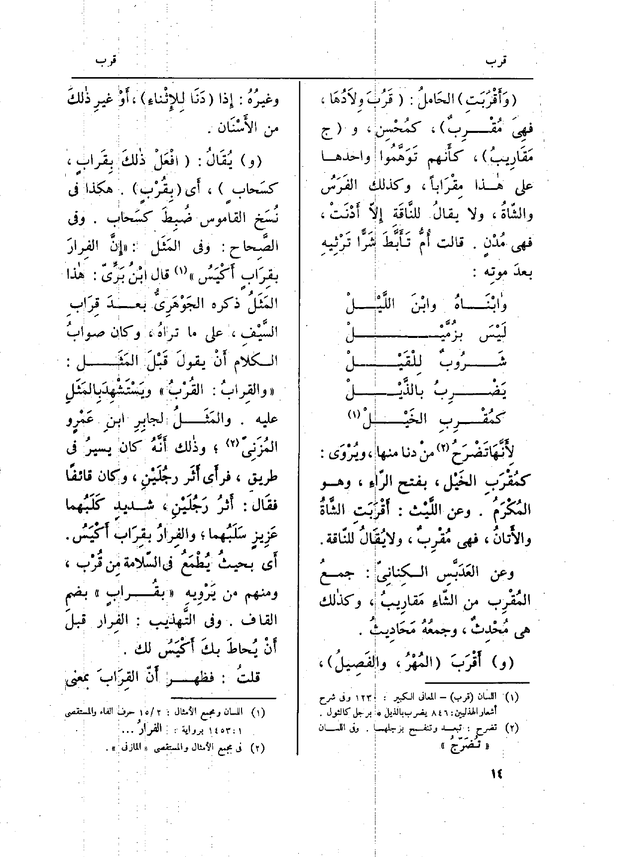 (و) يُقَالُ: (افْعَلْ ذالكَ بِقَرابٍ، كسَحابٍ) ، أَي (بِقُرْبٍ) . هَكَذَا فِي نُسَخ الْقَامُوس ضُبِطَ كسَحاب. وَفِي الصِّحاح: وَفِي المَثَل: (إِنَّ الفِرارَ بقِرَابٍ أَكْيَسُ) ، قَالَ ابنُ بَرِّيّ: هاذا المَثَلُ ذكره الجَوْهَرِيُّ بعدَ قِرَابِ السَّيْفِ، على مَا تراهُ، وَكَانَ صوابُ الْكَلَام أَنْ يقولَ قَبْلَ المَثَل: (والقِرابُ: القُرْبُ) ويَسْتَشْهِدَ بِالمَثَلِ عَلَيْهِ. والمَثَلُ لجابِرِ ابنِ عَمْرٍ والمُزَنِيّ؛ وذالك أَنَّهُ كَانَ يسيرُ فِي طَرِيق، فرأَى أَثَر رجُلَيْنِ، وَكَانَ قائفاً فقَال: أَثرُ رَجُلَيْنِ، شَدِيد كَلَبُهما عَزِيز سَلَبُهما؛ والفِرارُ بقِرَاب أَكْيَسُ. أَي بحيثُ يُطْمَعُ فِي السّلامة مِن قُرْب، وَمِنْهُم من يَرْوِيه: (بقُرابٍ) بِضَم الْقَاف. وَفِي التَّهذيب: الفِرار قبلَ أَنْ يُحاطَ بك أَكْيَسُ لَك.