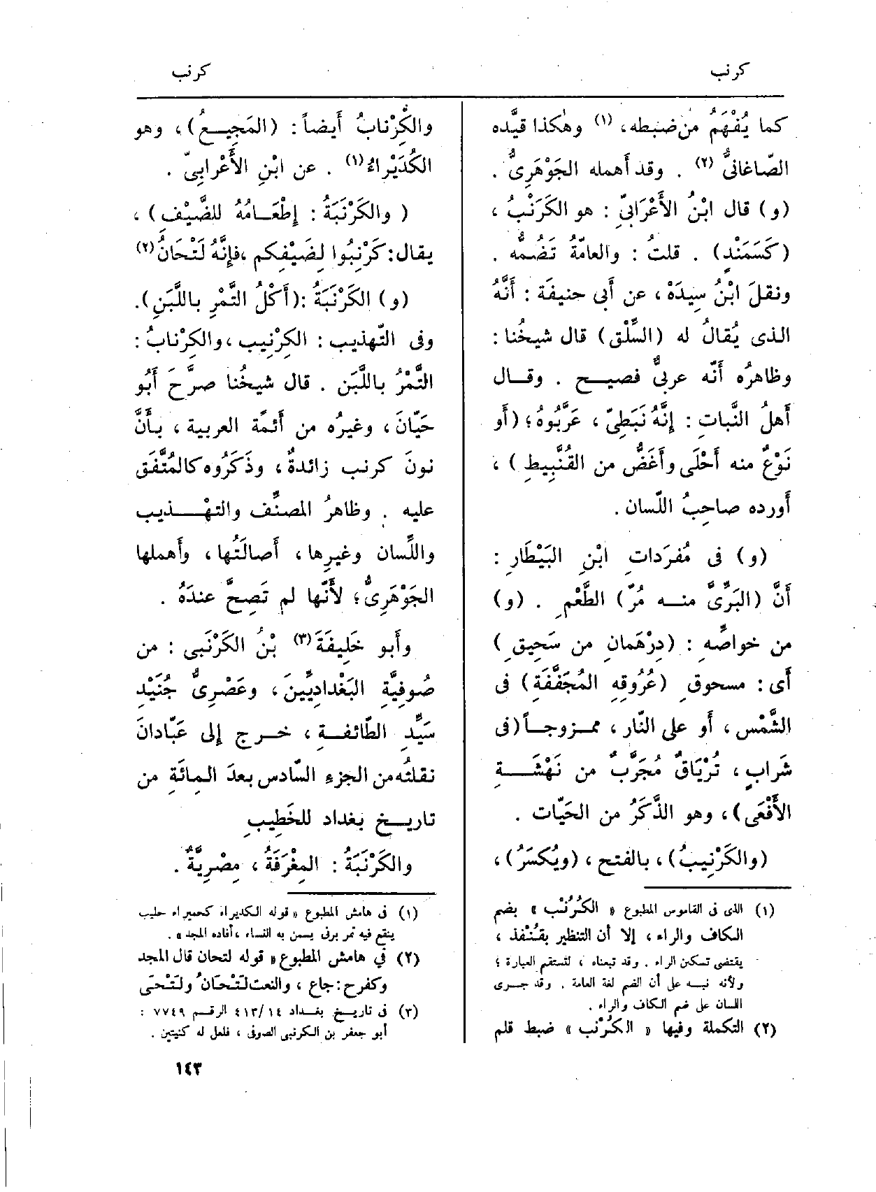 (و) الكَرْنَبَةُ: (أَكْلُ التَّمْرِ باللَّبَنِ) . وَفِي التّهذيب: الكِرْنِيب، والكِرْنابُ: التَّمْرُ باللَّبَن. قَالَ شيخُنا صرَّحَ أَبُو حَيّانَ، وغيرُه من أَئمّة الْعَرَبيَّة، بأَنَّ نونَ كرنب زائدةٌ، وذَكَرُوه كالمُتَّفَق عَلَيْهِ. وظاهرُ المصنِّف والتهْذيب واللِّسان وغيرِها، أَصالَتُها، وأَهملها الجَوْهَرِيُّ؛ لأَنّها لم تَصِحَّ عندَهُ.