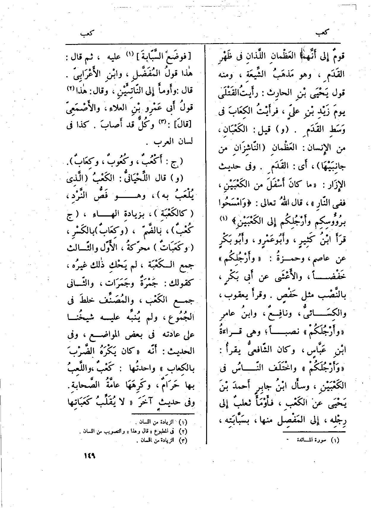 قومٌ إِلى أَنَّهما العَظْمانِ اللَّذانِ فِي ظَهْرِ القَدَمِ، وَهُوَ مَذهَبُ الشِّيعَةِ، وَمِنْه قَول يَحْيَى بْنِ الحارِث: رأَيتُ القَتْلَى يومَ زَيْدِ بْنِ عليَ، فرأَيْتُ الكِعَابَ فِي وَسَطِ القَدَمِ. (و) قيل: الكَعْبَانِ، من الإِنسان: العَظْمانِ (النّاشِزَانِ من جانِبَيْهَا) ، أَي: القَدَمِ. وَفِي حَدِيث الإِزَار: (مَا كانَ أَسْفَلَ من الكَعْبَيْنِ، فَفِي النّارِ) ، قَالَ اللَّهُ تَعَالَى: {وَامْسَحُواْ بِرُؤُوسِكُمْ وَأَرْجُلَكُمْ إِلَى الْكَعْبَينِ} (الْمَائِدَة:) ، قرَأَ ابْنُ كَثِيرٍ، وأَبُو عَمْرٍ و، وأَبُو بَكْرٍ عَن عَاصِم، وحمزةُ: (وأَرْجُلِكُم) خَفْضاً، والأَعْشَى عَن أَبي بَكْرٍ، بالنَّصْب مثل حَفْصٍ. وقرأَ يَعقوب، والكِسَائيُّ، ونافِعٌ، وابنُ عامرِ: (وأَرْجُلَكُمْ) نصبا؛ وَهِي قراءةُ ابْنِ عَبَّاسٍ، وَكَانَ الشّافعيُّ يقرأُ: (وَأَرْجُلَكُمْ) واخْتَلَف النّاسُ فِي الكَعْبَيْنِ، وسأَل ابْنُ جابِرٍ أَحمدَ بْنَ يَحْيَى عَن الكَعْبِ، فأَوْمَأَ ثَعلبٌ إِلى رِجْلِه، إِلى المَفْصِل مِنْهَا، بسَبَّابَتِه، فوضَع السَّبّابَة عَلَيْهِ، ثمَّ قَالَ: هاذا قولُ المُفَضَّلِ، وابْنِ الأَعْرابِيّ. قَالَ: وأَومأَ إِلى النّاتِئَيْنِ، وَقَالَ: هاذا قولُ أَبي عَمْرِو بْنِ العلاءِ، والأَصْمَعِيّ قالَ: وكُلٌّ قد أَصابَ. كَذَا فِي لِسَان الْعَرَب.