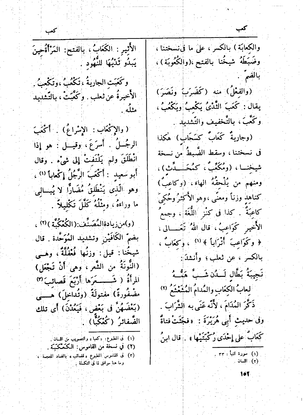 وكَعَبَتِ الجاريةُ: تَكْعُبُ، وتَكْعِبُ. الأَخيرةُ عَن ثَعْلَب. وكَعَّبَتْ، بالتّشديد مثلُه.