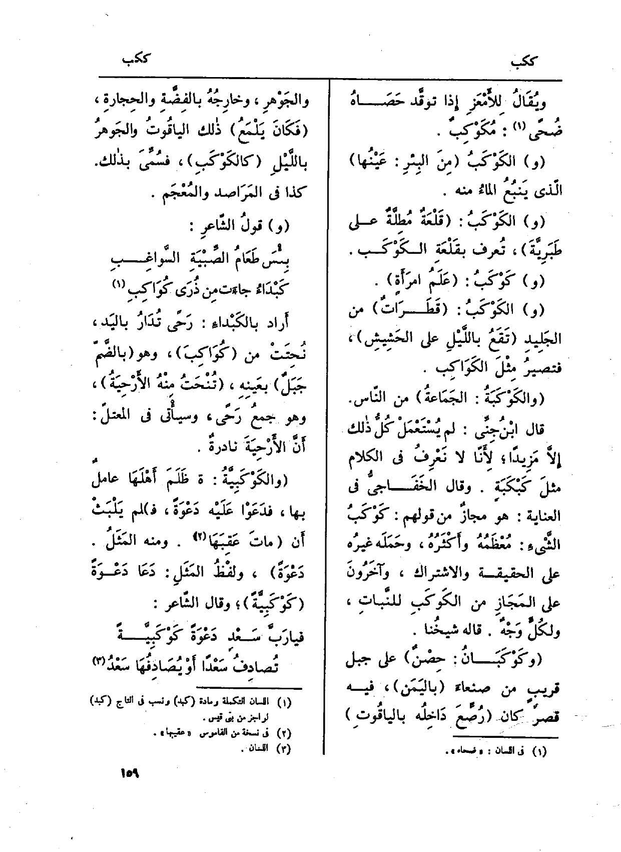(وكَوْكَبَانُ: حِصْنٌ) على جبل قريبٍ من صنعاءَ (باليَمَنِ) ، فِيهِ قصرٌ كَانَ (رُصِّعَ دَاخِلُه بالياقُوتِ) والجَوْهرِ، وخارِجُهُ بالفِضَّةِ والحِجارةِ، (فَكَانَ يَلْمَعُ) ذالك الياقُوتُ والجَوهرُ باللَّيْلِ (كالكَوْكَبِ) ، فسُمِّيَ بذالك. كَذَا فِي المَرَاصد والمُعْجَم.