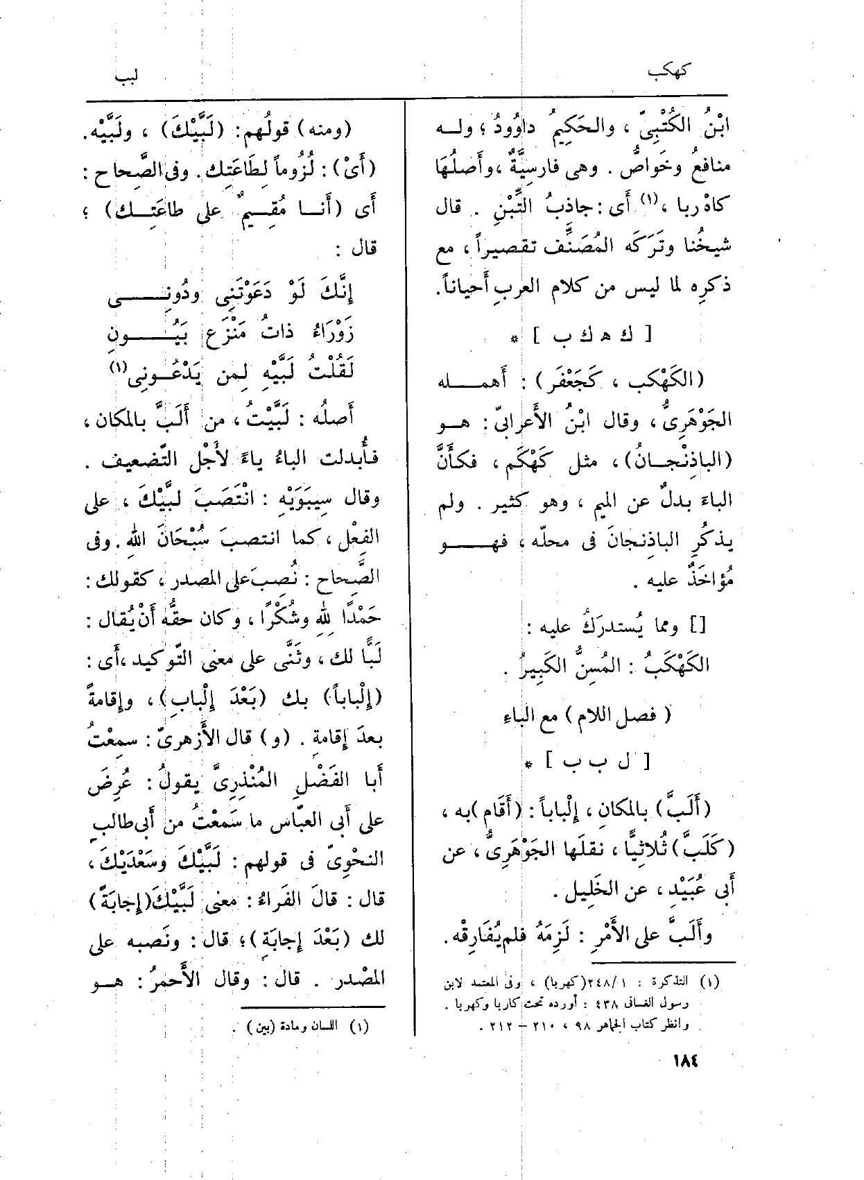 أَصلُه:} لَبَّيْتُ، من أَلَبَّ بِالْمَكَانِ، فأُبدلت الباءُ يَاء لأَجْل التّضعيف. وَقَالَ سِيبَوَيْهِ: انْتَصَبَ {لبَّيْكَ، على الفِعْل، كَمَا انتصبَ سُبْحَانَ اللَّهِ. وَفِي الصَّحاح: نُصِبَ على الْمصدر، كَقَوْلِك: حَمْداً لِلَّهِ وشُكْراً، وَكَانَ حقُّه أَنْ يُقال:} لَبّاً لَك، وثَنَّى على معنى التّوكيد، أَي: ( {إِلْباباً) بك (بَعْدَ} إِلْبابِ) ، وإِقامةً بعدَ إِقامةٍ. (و) قَالَ الأَزهريّ: سمِعْتُ أَبا الفَضْلِ المُنْذِرِيَّ يقولُ: عُرِضَ على أَبي العبّاس مَا سَمعْتُ من أَبي طَالب النحْوِيّ فِي قَوْلهم: لَبَّيْكَ وسَعْدَيْكَ، قَالَ: قالَ الفَراءُ: معنى لَبَّيْكَ (إِجابَةً) لَك (بَعْدَ إِجابَةِ) ؛ قَالَ: ونَصبه على المصْدر. قَالَ: وَقَالَ الأَحمرُ: هُوَ