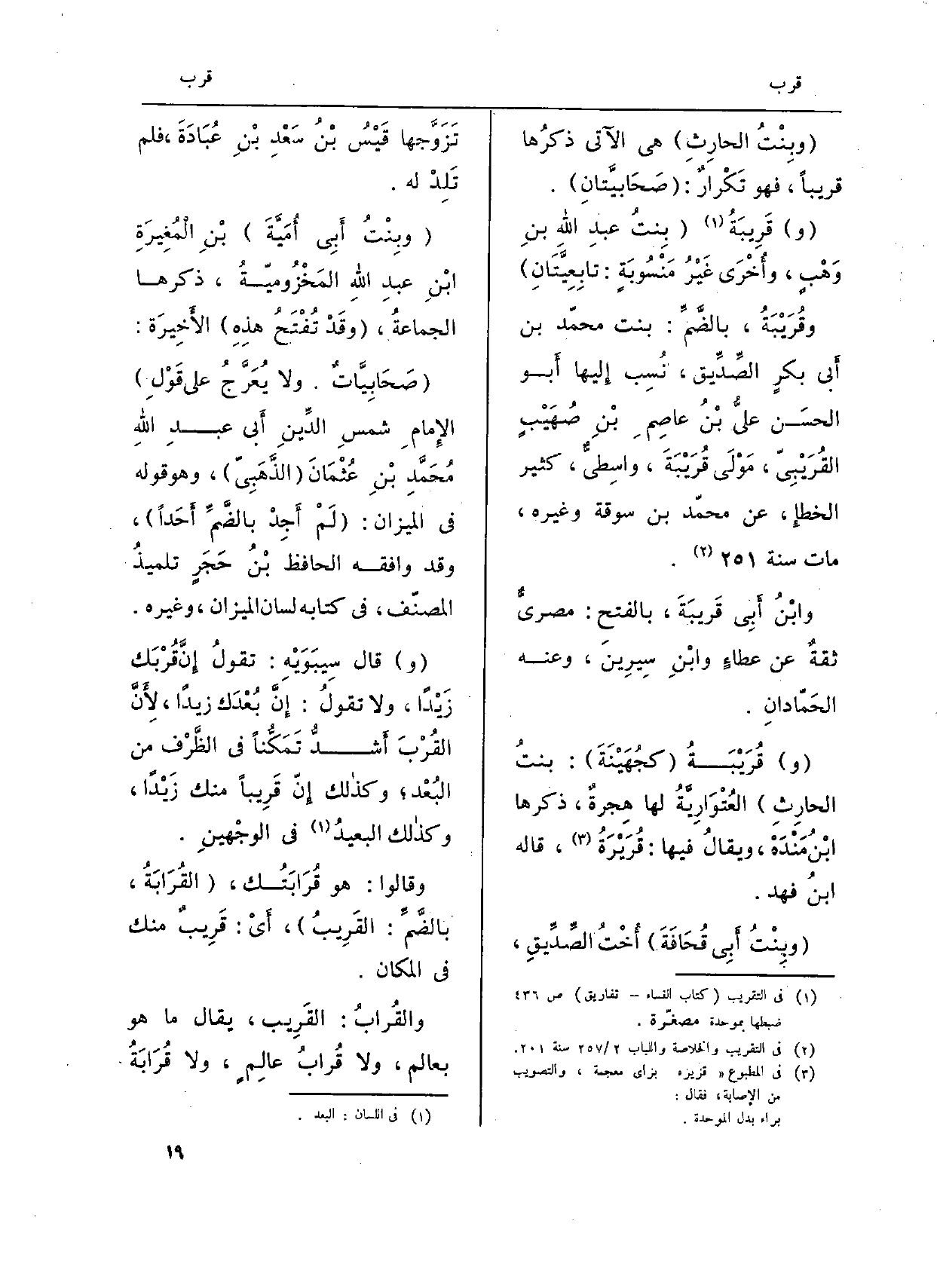 (و) قَرِيبَةُ (بِنْتُ عبدِاللَّهِ بنِ وَهْبٍ، وأُخْرَى غَيْرُ مَنْسُوبَةٍ: تابِعِيَّتَانِ) .