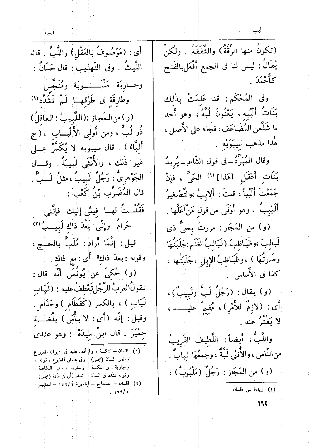 واللَّبُّ، أَيضاً: اللَّطِيف القَرِيبُ من النّاس، والأُنثى لَبَّةٌ، وجمعُهَا لِبابٌ.