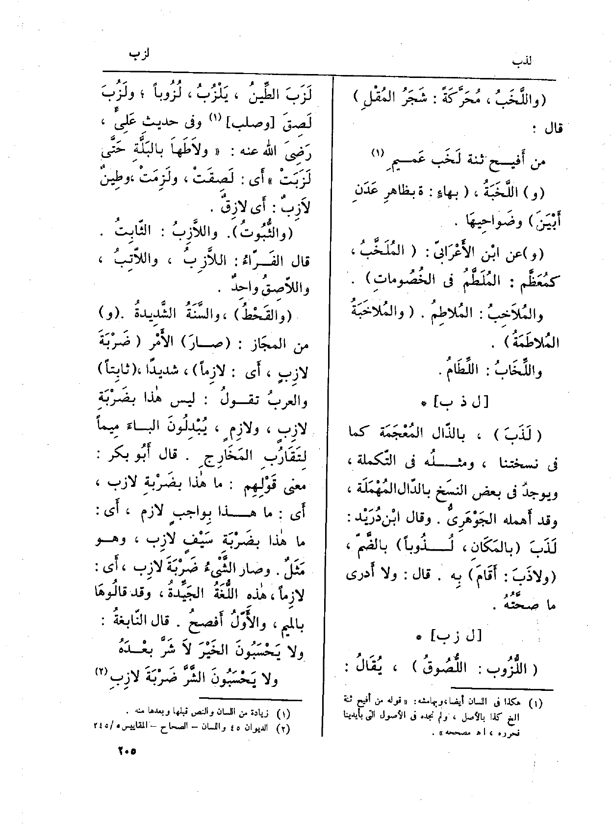 : (اللُّزُوب: اللُّصُوقُ) ، يُقَالُ: لَزَبَ الطِّينُ، يَلْزُبُ، لُزُوباً؛ ولَزُبَ لَصِقَ وصلب وَفِي حَدِيث عَلِيَ، رَضِيَ الله عَنهُ: (ولاَطَهَا بالبَلَّةِ حَتَّى لَزَبَتْ) أَي: لَصِقَتْ، ولَزِمَتْ، وطِينٌ لاَزِبٌ: أَي لازِقٌ.