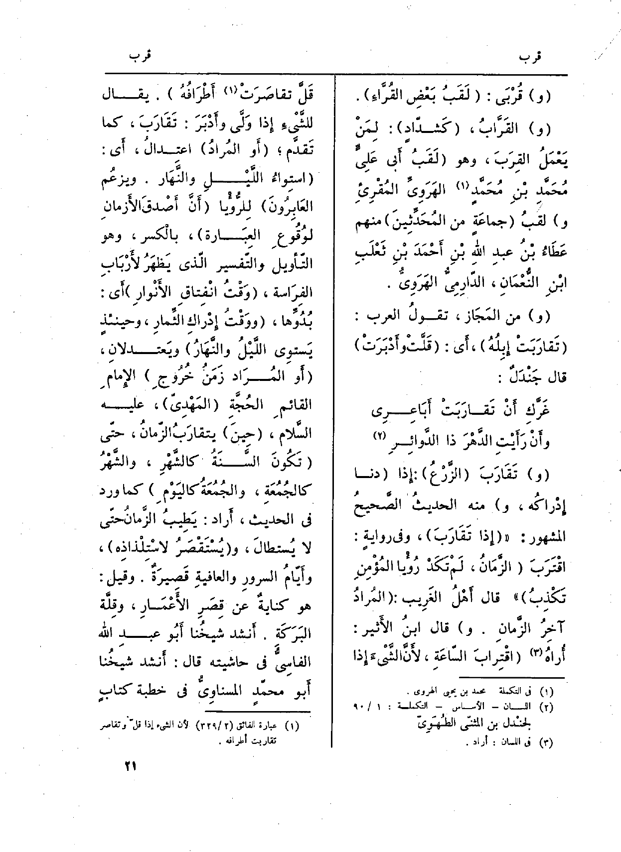 (و) تَقَارَبَ (الزَّرْعُ) : إِذا (دنا إِدْراكُه، و) مِنْهُ الحديثُ الصَّحيحُ الْمَشْهُور: ((إِذا تَقَارَبَ) ، وَفِي روايةٍ: اقْتَرَبَ (الزَّمَانُ، لَمْ تَكَدْ رُؤْيا المُؤْمِنِ تَكْذِبُ)) قَالَ أَهْلُ الغَرِيب: (المُرادُ آخِرُ الزَّمانِ. و) قَالَ ابنُ الأَثير: أُراهُ (اقْتِرابَ السَّاعَةِ، لأَنَّ الشَّيْءَ إِذا قَلَّ تَقاصَرَتْ أَطْرَافُهُ) . يُقَال للشَّيءِ إِذا وَلَّى وَأَدْبَرَ: تَقَارَبَ، كَمَا تَقدَّم؛ (أَو المُرادُ) اعتِدالُ، أَي: (استِواءُ اللَّيْلِ والنَّهَار. ويزعُم العَابِرُونَ) للِرُّؤْيا (أَنَّ أَصْدَقَ الأَزمانِ لوُقُوعِ العِبَارة) ، بالْكسر، وَهُوَ التّأويل والتّفسير الّذي يَظهَرُ لأَرْبَابِ الفِرَاسة، (وَقْتُ انْفِتاقِ الأَنْوارِ) أَي: بُدُوِّها، (وَوَقْتُ إِدْراكِ الثِّمارِ، وحينئذٍ يَستوِي اللَّيْلُ والنَّهَارُ) ويَعتدلانِ، (أَو المُرَاد زَمَنُ خُرُوجِ) الإِمامِ القائمِ الحُجَّةِ (المَهْدِيّ) ، عَلَيْهِ السَّلام، (حِينَ) يتقارَبُ الزَّمانُ، حتّى (تَكُونَ السَّنَةُ كالشَّهْرِ، والشَّهْرُ كالجُمُعَةِ، والجُمُعَةُ كاليَوْمِ) كَمَا ورد فِي الحَدِيث، أَراد: يَطِيبُ الزَّمانُ حتّى لَا يُستطالَ، و (يُسْتَقْصَرُ لاسْتِلْذاذِه) ، وأَيّامُ السرورِ والعافيةِ قَصِيرَةٌ. وَقيل: هُوَ كنايةٌ عَن قِصَرِ الأَعْمَارِ، وقِلَّة البَرَكَةِ. أَنشد شيخُنا أَبُو عبدِ الله الفاسِيُّ فِي حَاشِيَته قَالَ: أَنشد شيخُنا أَبو محمّدٍ المسناوِيُّ فِي خطْبَة كتابٍ