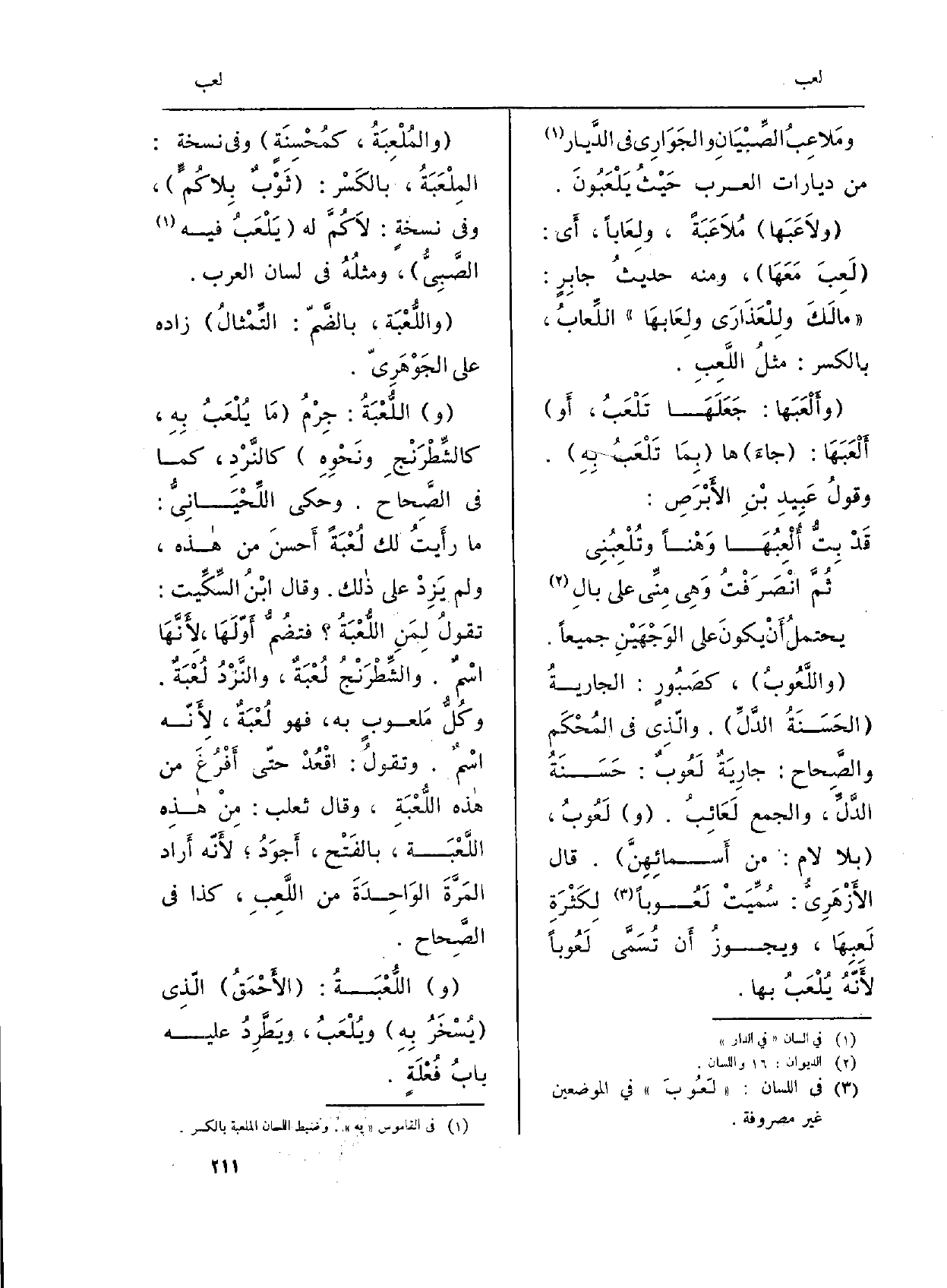 (واللَّعُوبُ) ، كصَبُورٍ: الجاريةُ (الحَسَنَةُ الدَّلِّ) . والّذِي فِي المُحْكَم والصَّحاح: جارِيَةٌ لَعُوبٌ: حَسَنَةُ الدَّلِّ، وَالْجمع لَعَائِبُ. (و) لَعُوبٍ، (بِلَا لامٍ: من أَسمائِهِنَّ) . قَالَ الأَزْهَرِيُّ: سُمِّيَتْ لَعُوباً لِكَثْرَةِ لَعِبِهَا. ويجوزُ أَن تُسَمَّى لَعُوباً لأَنّهُ يُلْعَبُ بهَا.