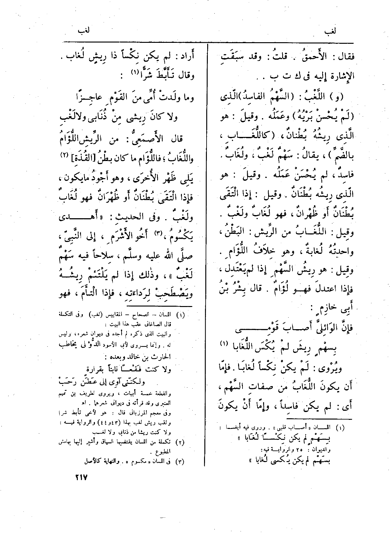 ويُرْوى: لَمْ يكنْ نِكْساً لُغابَاً. فإِمّا أَن يكونَ اللُّغَابُ من صفاتِ السَّهْم، أَي: لم يكن فاسِداً، وإِمّا أَنْ يكونَ أَراد: لم يكن نِكْساً ذَا رِيشٍ لُغاب. وَقَالَ تأَبَّطَ شَرّاً: