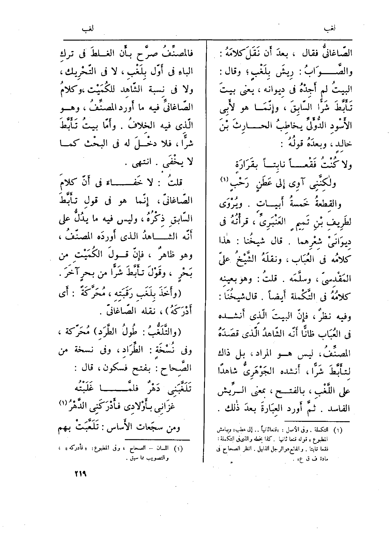 الصّاغانيُّ فَقَالَ، بعدَ أَن نَقَلَ كلامَهُ: والصَّوَابُ: رِيشَ بِلَغْبٍ؛ وَقَالَ: البيتُ لم أَجِدْهُ فِي دِيوانه، يَعْنِي بيتَ تَأَبَّطَ شَرّاً السّابِقَ، وإِنّمَا هُوَ لأَبِي الأَسْودِ الدُّؤْليِّ يخاطِبُ الحارِثَ بْنَ خالِدٍ، وبعدَهُ قولُهُ: