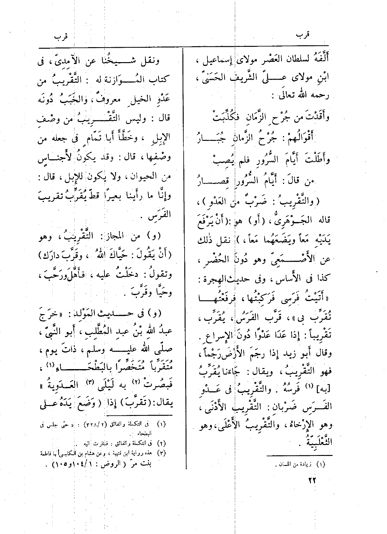 (والتَّقْرِيبُ: ضَرْبٌ من العَدْوِ) ، قَالَه الجَوْهَرِيُّ، (أَو) هُوَ: (أَنْ يَرْفَعَ يَدَيْهِ مَعاً ويَضَعَهُما مَعاً) ، نقل ذالك عَن الأَصْمَعِيّ وَهُوَ دُونَ الحُضْرِ، كَذَا فِي الأَساس، وَفِي حَدِيث الهِجرة: (أَتَيْتُ فَرَسِي فَرَكِبْتُها، فرفَعْتُها تُقَرِّب بِي) ، قَرَّب الفَرَسُ، يُقَرِّب، تَقْرِيباً: إِذا عَدَا عَدْواً دُونَ الإِسراعِ. وَقَالَ أَبو زيد: إِذا رجَمَ الأَرْضَ رَجْماً، فَهُوَ التَّقْرِيبُ، وَيُقَال: جَاءَنا يُقَرِّبُ بِهِ فَرسُهُ. والتَّقْرِيبُ فِي عَدْوِ الفَرَسِ ضَرْبانِ: التَّقْرِيب الأَدْنَى، وَهُوَ الإِرْخاءُ، والتَّقْرِيبُ الأَعْلَى، وَهُوَ الثَّعْلَبِيّةُ.