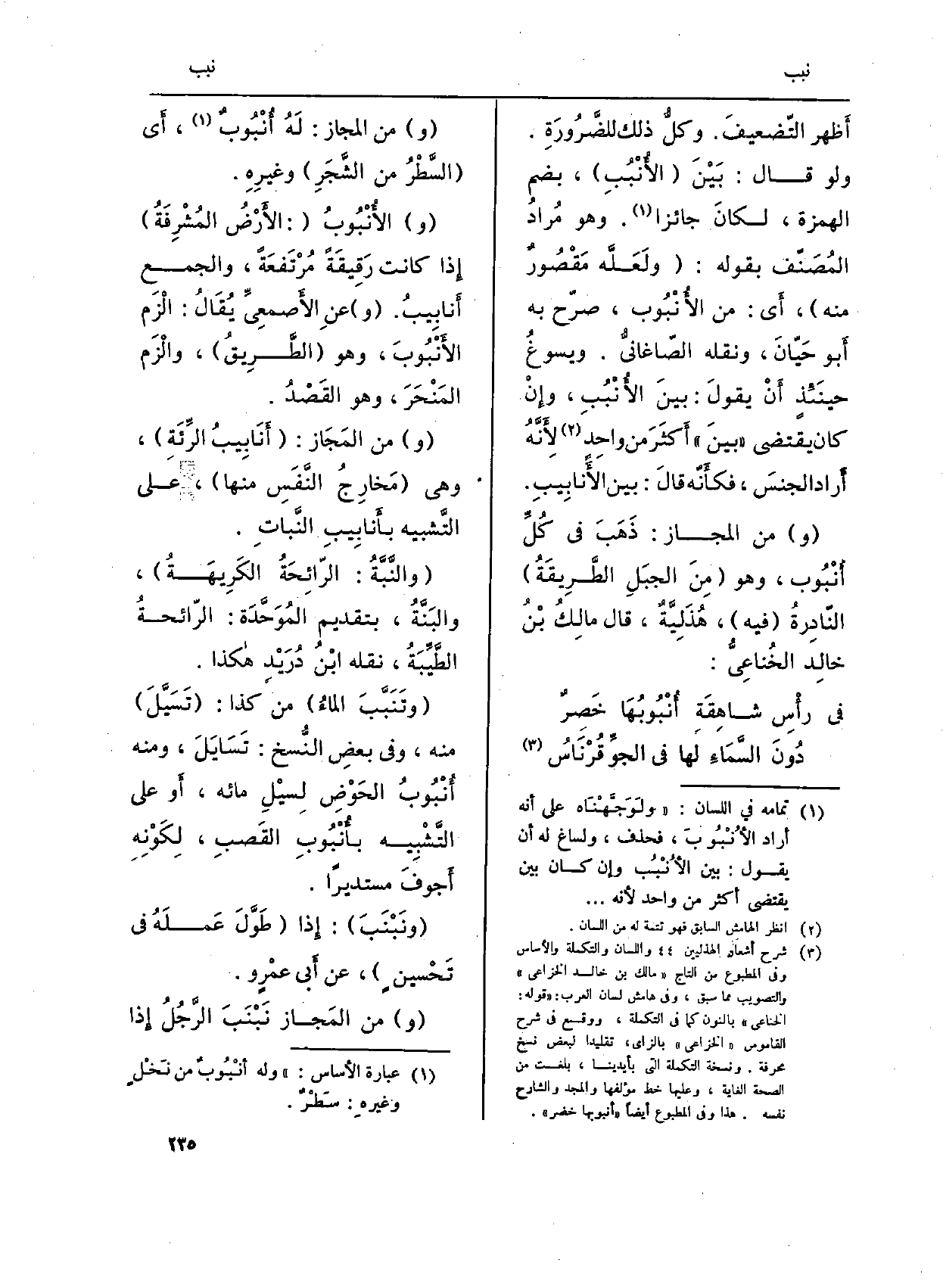 أَظهر التّضعيفَ. وكلُّ ذَلِك للضَّرُورَةِ. وَلَو قَالَ: بَيْنَ (الأُنْبُبِ) ، بِضَم الْهمزَة، لكانَ جَائِزا. وَهُوَ مُرادُ المُصَنّف بقوله: (ولَعَلَّه مَقْصُورٌ مِنْهُ) ، أَي: من الأُنْبُوب، صرّح بِهِ أَبو حَيّانَ، وَنَقله الصّاغانيُّ. ويسوغُ حينَئذٍ أَنْ يقولَ: بينَ الأُنْبُبِ، وإِنْ كَانَ يَقْتَضِي (بينَ) أَكثَرَ من واحِدٍ لأَنَّهُ أَراد الجنسَ، فكأَنّه قالَ: بَين الأَنابِيبِ.