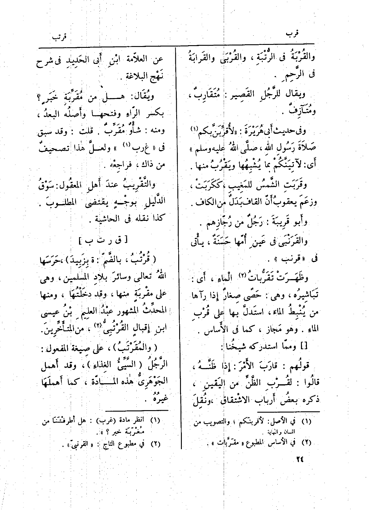 وقَرَبَتِ الشَّمسُ للمَغِيبِ، كَكَرَبَتْ، وزعَمَ يعقوبُ أَنّ الْقَاف بَدَلٌ من الْكَاف.