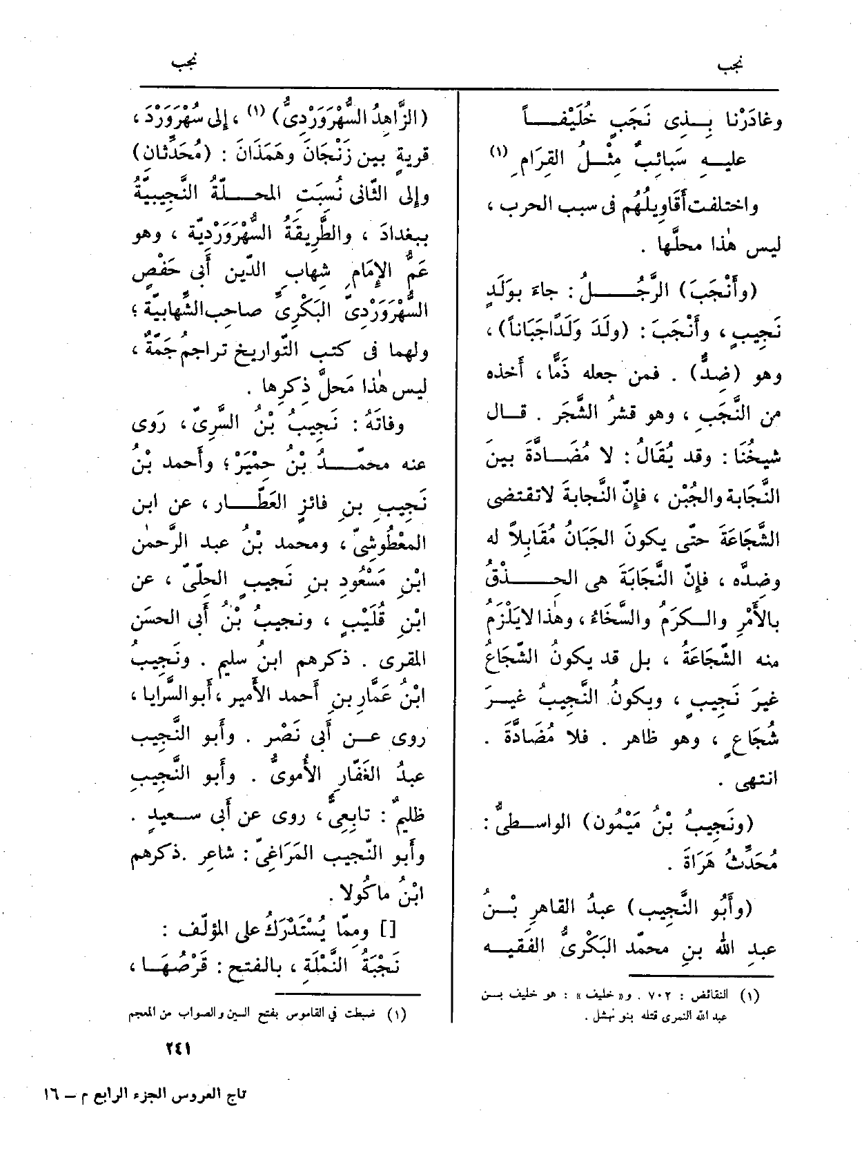 (وأَبُو النَّجِيب) عبدُ القاهرِ بْنُ عبدِ اللَّه بنِ محمّد البَكْريُّ الفَقيه (الزَّاهِدُ السُّهْرَوَرْدِيُّ) ، إِلى سُهْرَوَرْدَ، قريةٍ بَين زَنْجَانَ وهَمَذَانَ: (مُحَدِّثانِ) وإِلى الثّاني نُسِبَتِ المحلّةُ النَّجِيبيّةُ ببغدادَ، والطَّرِيقَةُ السُّهْرَوَرْدِيّة، وَهُوَ عَمُّ الإِمَامِ شِهابِ الدّين أَبي حَفْصٍ السُّهْرَوَرْدِيّ البَكْرِيِّ صاحِب الشِّهابيّة؛ وَلَهُمَا فِي كتب التّواريخ تراجمُ جَمّةٌ، لَيْسَ هاذا مَحَلَّ ذِكرِها.