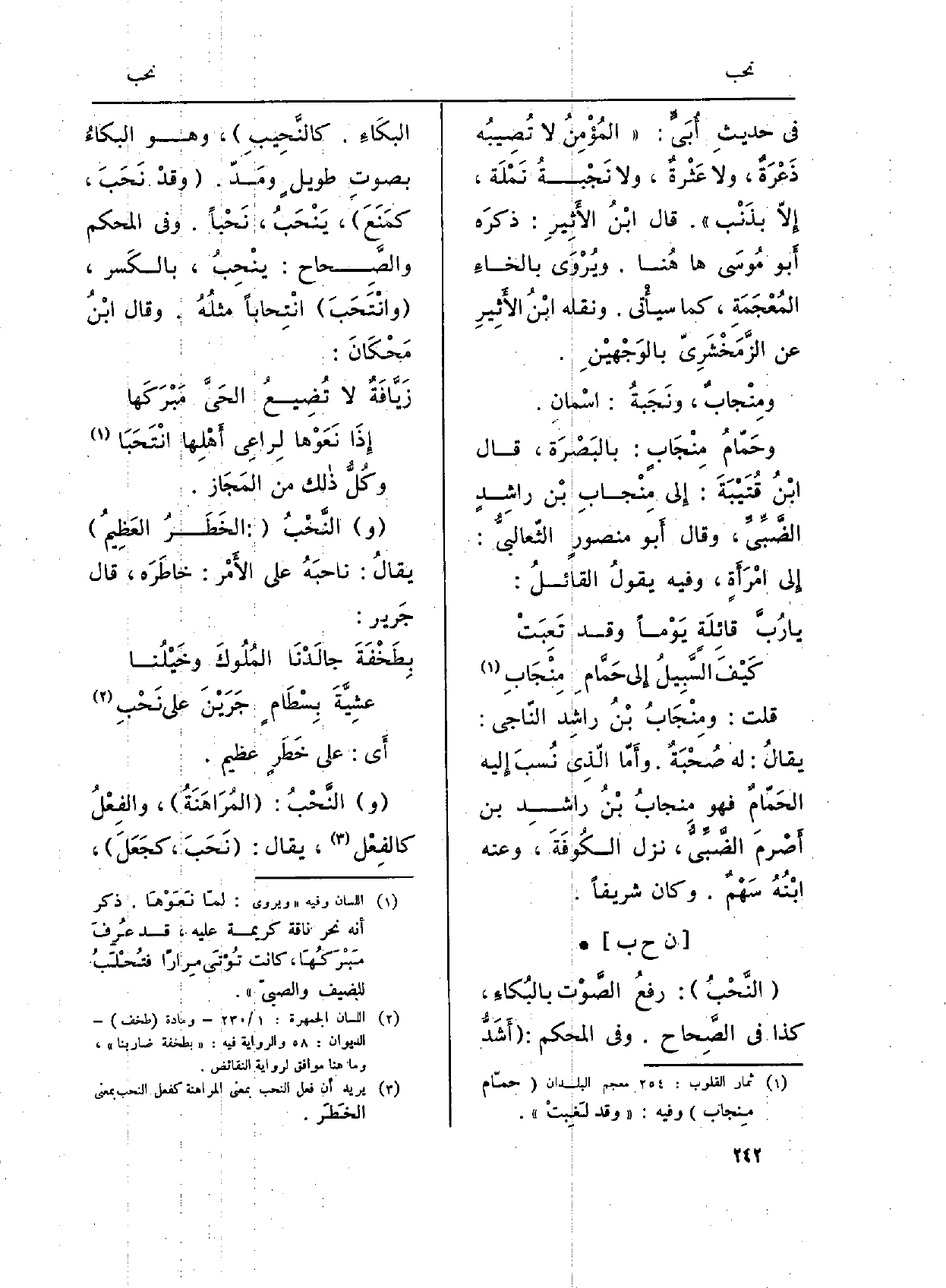 : (النَّحْبُ) : رفعُ الصَّوْت بالبُكاءِ، كَذَا فِي الصَّحاح. وَفِي الْمُحكم: (أَشَدُّ البكَاءِ. كالنَّحِيبِ) ، وَهُوَ البكاءُ بصوتٍ طويلٍ ومَدّ. (وقدْ نَحَبَ، كمَنَعَ) ، يَنْحَبُ، نَحْباً. وَفِي الْمُحكم والصَّحاح: ينْحِبُ، بالكَسر، (وانْتَحَبَ) انُتِحاباً مثلُهُ. وَقَالَ ابْنُ مَحْكَانَ: