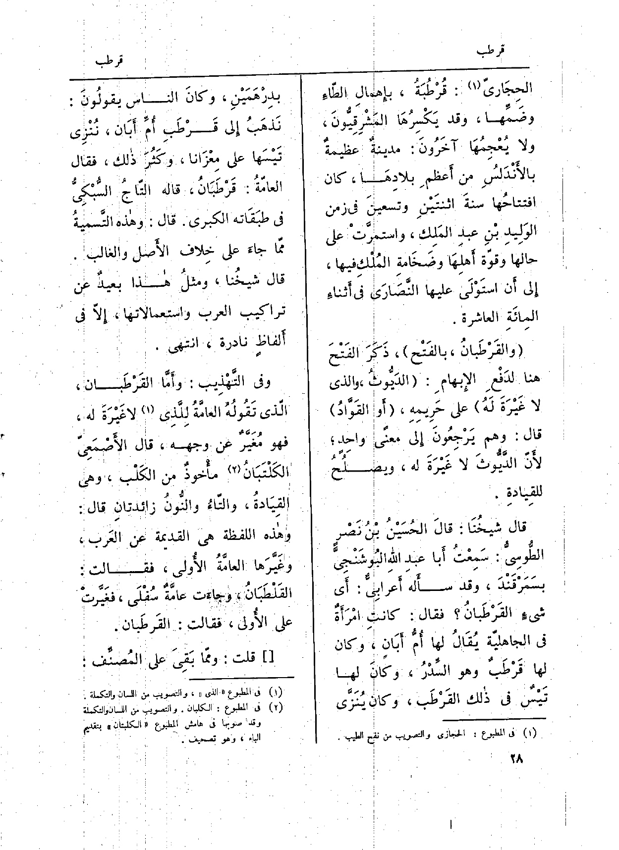 الحِجَاريّ: قُرْطُبَةُ، بإِهمالِ الطّاءِ وضَمِّها، وَقد يَكْسِرُهَا المَشْرِقِيُّونَ، وَلَا يُعْجِمُهَا آخَرُونَ: مدينةٌ عظيمةٌ بالأَنْدَلُسِ مِن أَعْظمِ بِلادِهَا، كَانَ افتتاحُها سنةَ اثنتَيْنِ وتسعينَ فِي زمن الوَلِيدِ بْنِ عبدِالمَلِك، واستمرَّتْ على حَالهَا وقوّة أَهلِهَا وضَخَامةِ المُلْكِ فِيهَا، إِلى أَنْ استَوْلَى عَلَيْهَا النَّصَارَى فِي أَثناءِ المِائَةِ الْعَاشِرَة.