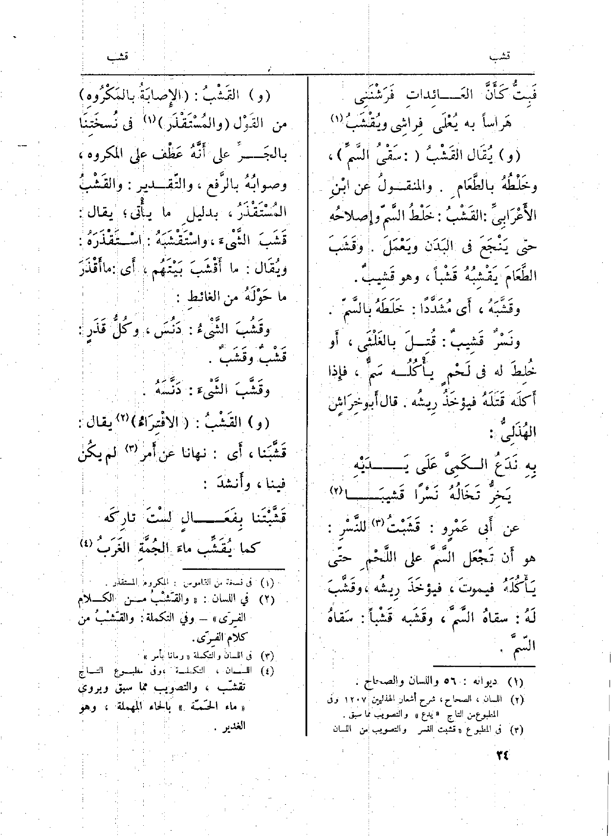 (و) القَشْبُ: (الإِصابَةُ بالمَكْرُوهِ) من القَوْل (والمُسْتَقْذَر) فِي نُسخَتِنَا بالجرِّ على أَنَّهُ عَطْف على الْمَكْرُوه، وصوابُهُ بالرَّفع، والتّقدير: والقَشْبُ المُسْتَقْذَرُ، بدليلِ مَا يأْتي؛ يُقَال: قَشَبَ الشَّيْءَ، واسْتَقْشَبَهُ: اسْتَقْذَرَهُ: ويُقَال: مَا أَقْشَبَ بَيْتَهُم، أَي: مَا أَقْذَرَ مَا حَوْلَهُ من الغائطِ.