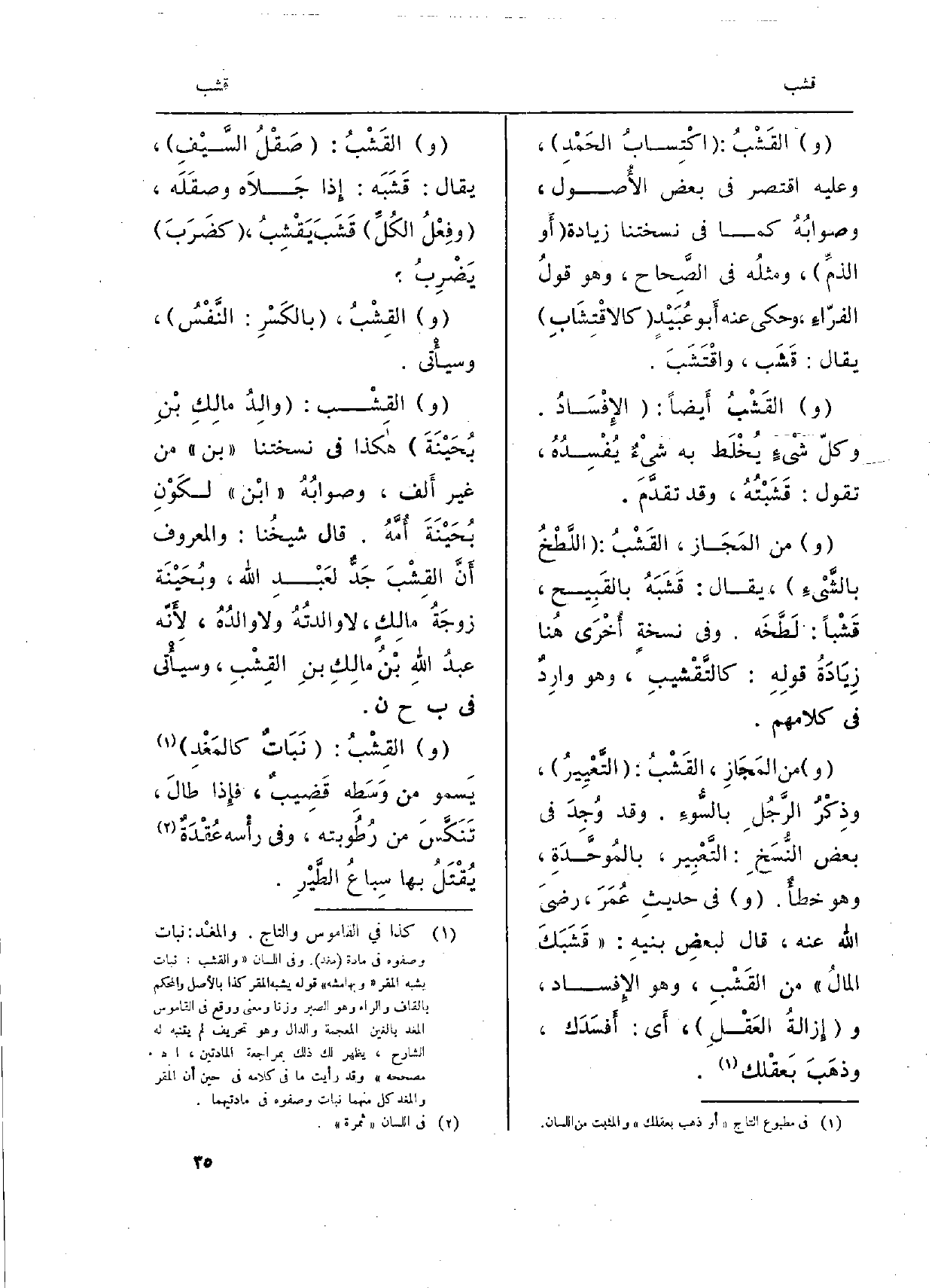 (و) من المَجَاز، القَشْبُ: (اللَّطْخُ بالشَّيْءِ) ، يُقَال: قَشَبَهُ بالقَبِيح، قَشْباً: لَطَّخَه. وَفِي نسخةٍ أُخْرَى هُنا زِيَادَةُ قولِهِ: كالتَّقْشِيبِ، وَهُوَ وارِدٌ فِي كَلَامهم.