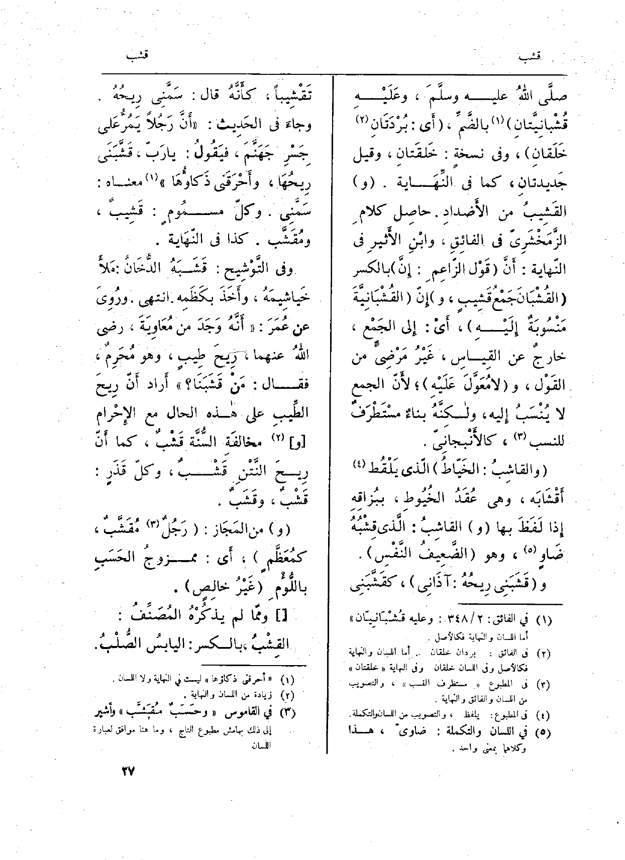 صلى الله عَلَيْهِ وَسلم وعَلَيْهِ قُشْبانِيَّتانِ) بالضَّمِّ، (أَي: بُرْدَتَانِ خَلَقانِ) ، وَفِي نسخةٍ: خَلقَتانِ، وَقيل: جَديدتانِ، كَمَا فِي النِّهَاية. (و) القَشِيبُ من الأَضدادِ. حاصِل كلامِ الزَّمَخْشَرِيّ فِي الفائِقِ، وابْنِ الأَثيرِ فِي النّهاية: أَنَّ (قَوْل الزّاعِمِ: إِنَّ) بِالْكَسْرِ (القُشْبَانَ جَمْعُ قَشِيبٍ، و) إِنّ (القُشْبَانِيَّةَ مَنْسُوبَةٌ إِلَيْهِ) ، أَيْ: إِلى الجَمْع، خارجٌ عَن القِياسِ، غَيْرُ مَرْضِيَ من القَوْل، و (لَا مُعَوَّلَ عَلَيْهِ) ؛ لأَنّ الْجمع لَا يُنْسَبُ إِليه، ولاكِنَّهُ بناءٌ مسْتَطْرَفٌ للنسب، كالأَنْبجانِيّ.