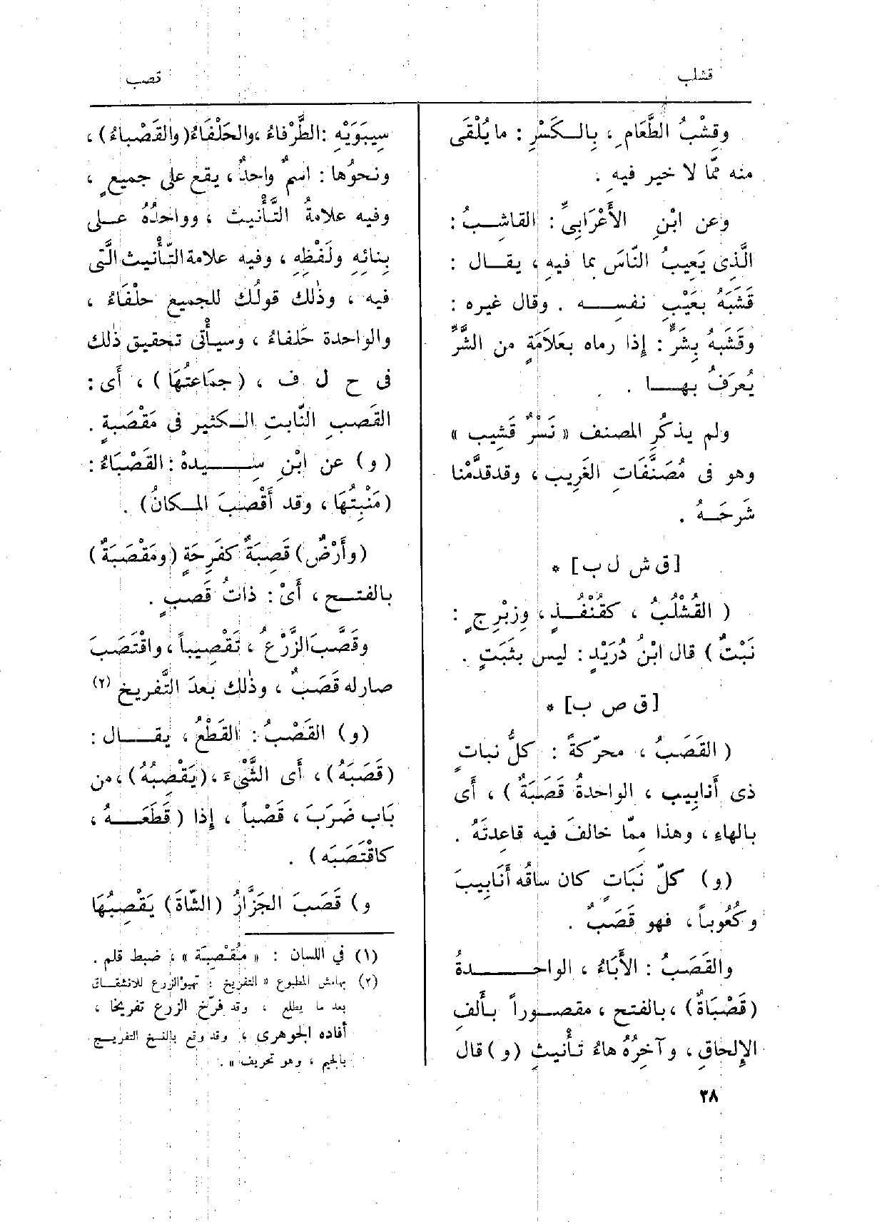 : (القَصَبُ، محرّكةً: كلُّ نباتٍ ذِي أَنابِيبَ، الواحدةُ قَصَبَةٌ) ، أَي بالهاءِ، وَهَذَا مِمّا خالفَ فِيهِ قاعِدتَهُ.
