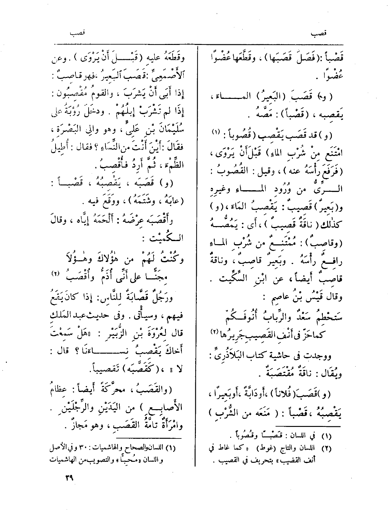 (و) قد قَصَب يَقْصِب (قُصُوباً: امْتَنَع مِنْ شُرْبِ الماءِ) قَبْلَ أَنْ يَرْوَى، (فرَفَعَ رَأْسَهُ عَنهُ) ، وَقيل: القُصُوبُ: الرِّيُّ من وُرُودِ الماءِ وغيرِهِ و (بَعِيرٌ) قَصِيبٌ: يَقْصِبُ المَاءَ، (و) كذالك (ناقَةٌ قَصِيبٌ) ، أَي: يَمُصُّهُ (وقاصِبٌ) : مُمْتَنِعٌ من شُرْبِ الماءِ رافِعٌ رأْسَهُ. وبَعِيرٌ قاصِبٌ، وناقةٌ قاصِبٌ أَيضاً، عَن ابْنِ السِّكِّيت. وَقَالَ قَيْسُ بْنُ عاصِم: