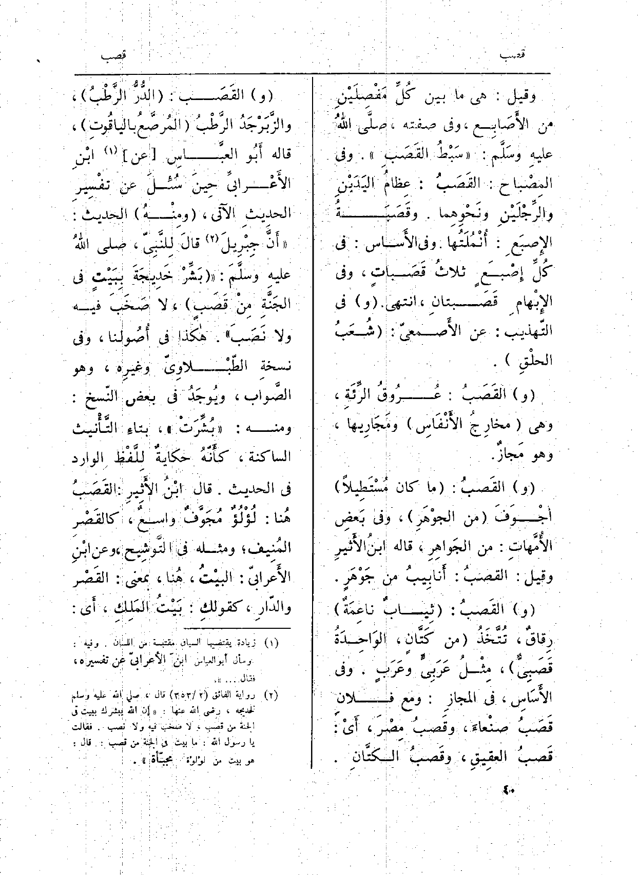 (و) القَصَب: (الدُّرُّ الرَّطْبُ) ، والزَّبَرْجدُ الرَّطْبُ (المُرَصَّعُ بالياقُوتِ) ، قَالَه أَبُو العبَّاسِ عَن ابْنِ الأَعْرابيِّ حِينَ سُئِلَ عَن تفْسِيرِ الحديثِ الْآتِي، (ومِنْهُ) الحَدِيث: (أَنَّ جِبْرِيلَ قالَ لِلنَّبيّ، صلى الله عَلَيْهِ وَسلم (بَشِّرْ خَدِيجَةَ بِبَيْتٍ فِي الجنَّةِ مِنْ قَصَبٍ) ، لَا صَخَبَ فِيهِ وَلَا نَصَبَ) . هاكذا فِي أُصُولنا، وَفِي نسخةِ الطّبْلاوِيّ وغيرِه، وَهُوَ الصَّواب، ويُوجَدُ فِي بعض النّسخ: وَمِنْه: (بُشِّرَتْ) ، بتاء التَّأْنيث الساكنة، كأَنّهُ حكايةٌ لِلَّفْظ الْوَارِد فِي الحَدِيث. قَالَ ابْنُ الأَثِيرِ: القَصَبُ هُنا: لُؤْلُؤٌ مُجَوَّفٌ واسعٌ، كالقَصْرِ المُنِيف؛ وَمثله فِي التَّوشِيح، وَعَن ابْنِ الأَعرابيّ: البيْتُ، هُنا، بِمَعْنى: القَصْر والدّارِ، كقولكِ: بَيْتُ المَلِكِ، أَي: