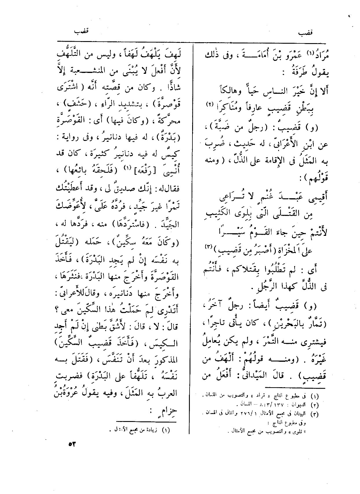 (و) قَضِيبٌ أَيضاً: رجلٌ آخَرُ، (تَمَّارٌ بالبَحْرَيْنِ) ، كَانَ يأْتي تاجِراً، فيشترِي مِنْهُ التَّمْرَ، وَلم يكن يُعامِلُ غَيْرَهُ. (وَمِنْه قولُهُمْ: أَلْهَفُ من قَضِيبٍ) . قالَ المَيْدانيُّ: أَفْعَلُ من لَهِفَ يَلْهَفُ لَهَفاً، وَلَيْسَ من التَّلَهُّفِ لاِءَنَّ أَفْعلَ لَا يُبْنَى من المنشعبة إِلاَّ شاذّاً. وَكَانَ من قِصَّتِه أَنَّه (اشْتَرَى قَوْصرَّةَ) ، بتشدِيدِ الرّاءِ، (حَشَفٍ) ، محرَّكةً، (وكانَ فِيهَا) أَي: القَوْصَرَّةِ (بَدْرَةٌ) ، لَهُ فِيهَا دنانيرُ، وَفِي رِوَايَة: كِيسٌ لَهُ فِيهِ دنانِيرُ كثيرَة، كَانَ قد أُنْسِيَ رَفْعَه (فَلَحِقَهُ بائِعُها) ، فَقَالَ لَهُ: إِنّك صديقٌ لي، وَقد أَعطَيْتُك تَمْراً غيرَ جَيِّدٍ، فرُدَّهُ عَلَيَّ، لأُعَوِّضَكَ الجَيِّدَ. (فاسْتَرَدَّهَا) مِنْهُ، فرَدَّها لَهُ، (وكَانَ مَعَهُ سِكِّينٌ) ، حَمَله (ليَقْتُلَ بِهِ نَفْسَه إِنْ لم يَجِدِ البَدْرَةَ) ، فَأَخَذَ القَوْصَرَّةَ وَأَخْرَجَ مِنْهَا البَدْرَة، فنَثَرَها، وأَخْرَجَ مِنْهَا دَنانيرَه، وقالَ للأَعرابيّ: أَتَدْرِي لِمَ حَمَلْتُ هاذا السِّكّينَ معي؟ قالَ: لَا، قالَ: لأَشُقَّ بَطني إِنْ لَمْ أَجِدِ الكِيسَ، (فَأَخَذَ قَضِيبٌ السِّكِّينَ) المذكورَ بعدَ أَنْ تَنَفَّسَ، (فقَتَلَ بِهِ نَفْسَهُ، تَلَهُّفاً على البَدْرَةِ) فضربتِ العربُ بهِ المَثَلَ، وَفِيه يقولُ عُرْوَةُ بْنُ حِزامٍ: