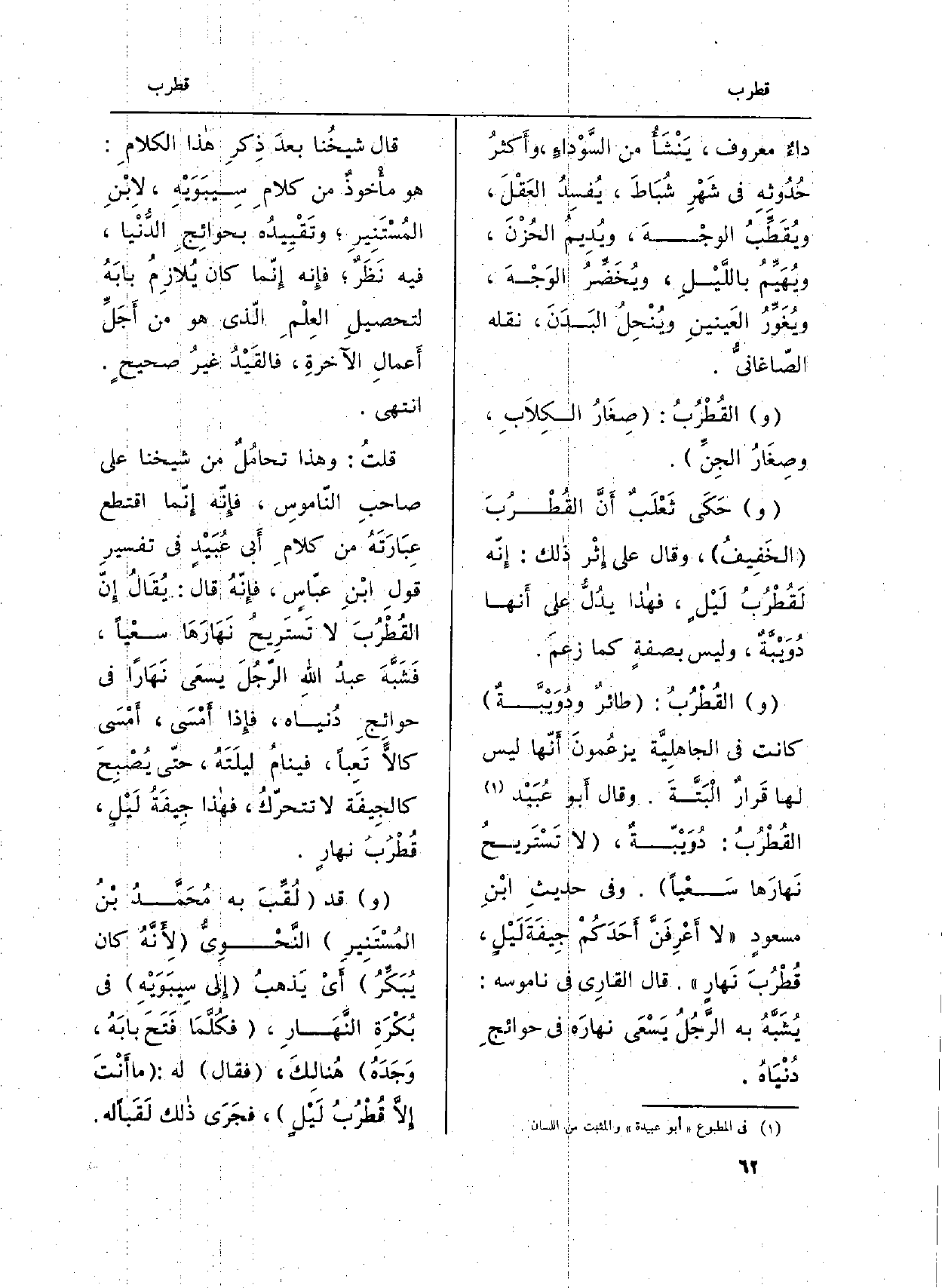 قلتُ: وَهَذَا تحامُلٌ من شَيخنَا على صاحبِ النّاموسِ، فإِنّه إِنّما اقتطع عِبَارَتَهُ من كلامِ أَبي عُبَيْدٍ فِي تفسيرِ قولِ ابْنِ عبّاسٍ، فإِنّهُ قَالَ: يُقَالُ: إِنّ القُطْرُبَ لَا تَستَرِيحُ نَهَارَها سعْياً، فَشَبَّهَ عبدُ اللَّهِ الرّجُلَ يسعَى نَهَاراً فِي حوائِجِ دُنْياه، فإِذا أَمْسَى، أَمْسَى كالاًّ تَعِباً، فينامُ ليلَتَهُ، حتّى يُصْبِحَ كالجِيفَة لَا تتحرّكُ، فهاذا جِيفَةُ لَيْلٍ، قُطْرُبُ نهارٍ.