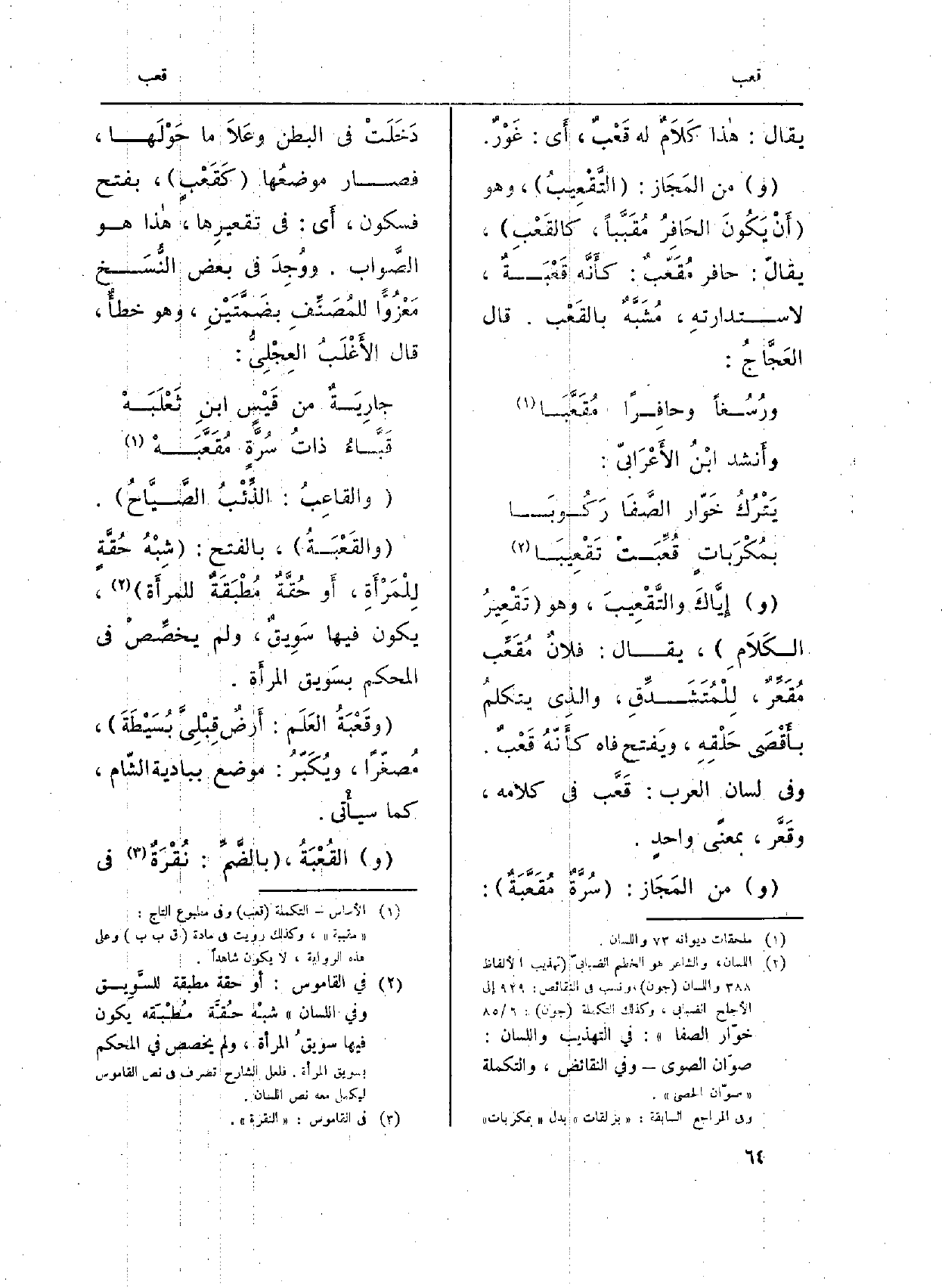 (و) من المَجَاز: (سُرَّةٌ مُقَعَّبَةٌ) : دَخَلَتْ فِي الْبَطن وعَلاَ مَا حَوْلَها، فَصَارَ موضعُها (كَقَعْبٍ) ، بِفَتْح فَسُكُون، أَي: فِي تقعيرِها، هاذا هُوَ الصَّواب. ووُجِدَ فِي بعض النُّسَخ مَعْزُوّاً للمُصَنِّفِ بضَمَّتَيْنِ، وَهُوَ خطأٌ، قَالَ الأَغْلَبُ العِجْلِيُّ: