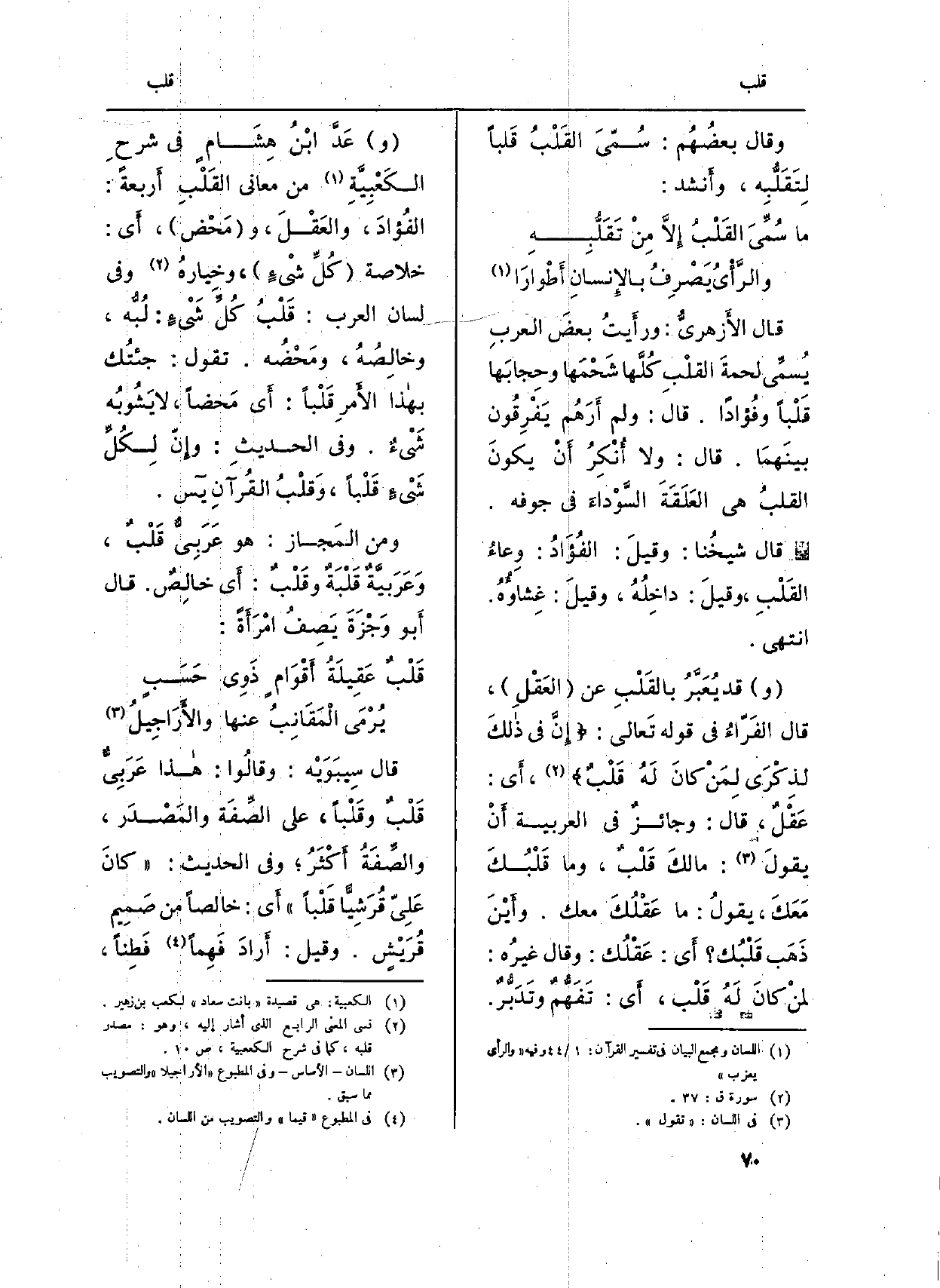 (و) قد يُعَبَّرُ بالقَلْبِ عَن (العَقْلِ) ، قَالَ الفَرّاءُ فِي قَوْله تَعالى: {إِنَّ فِى ذالِكَ لَذِكْرَى لِمَن كَانَ لَهُ قَلْبٌ} (قلله: 37) ، أَي: عَقْلٌ، قَالَ: وجائزٌ فِي الْعَرَبيَّة أَنْ يقولَ: مَا لكَ قَلْبٌ، وَمَا قَلْبُكَ مَعَكَ، يقولُ: مَا عَقْلُكَ مَعَك. وأَيْنَ ذَهَبَ قَلْبُك؟ أَي: عَقْلُك. وَقَالَ غيرُه: لمنْ كانَ لَهُ قَلْب، أَي: تَفَهُّمٌ وتَدَبُّرٌ.