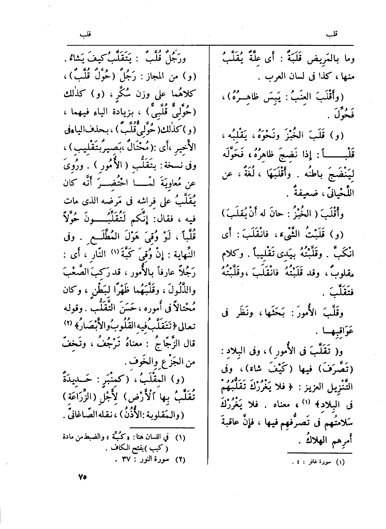 و (تَقَلَّبَ فِي الأُمورِ) ، وَفِي البِلادِ: (تَصَرَّفَ) فِيهَا (كَيْفَ شاءَ) ، وَفِي التَّنْزِيل الْعَزِيز: {فَلاَ يَغْرُرْكَ تَقَلُّبُهُمْ فِى الْبِلاَدِ} (غَافِر: 4) ، مَعْنَاهُ: فَلَا يَغْرُرْكَ سَلامتُهم فِي تَصرُّفِهم فِيهَا، فإِنَّ عاقبةَ أَمرِهم الهلاكُ.