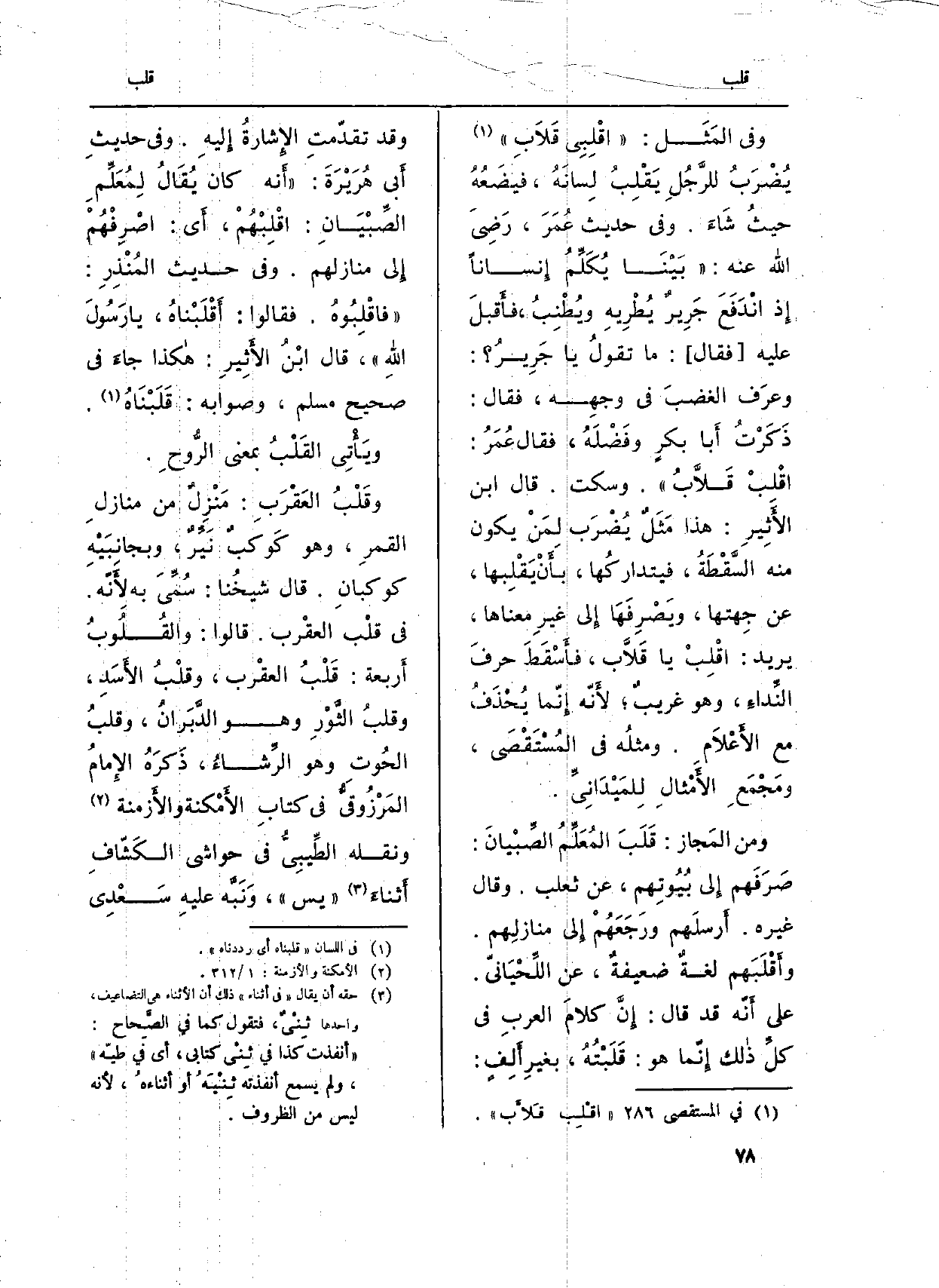 وَفِي المَثَل: (اقْلِبِي قَلاَبِ) يُضْرَبُ للرَّجُلِ يَقْلِبُ لِسانَهُ، فيضَعُهُ حيثُ شَاءَ. وَفِي حَدِيث عُمَرَ، رَضِيَ الله عَنهُ: (بَيْنَا يُكَلِّمُ إِنساناً إِذ انْدَفَعَ جَرِيرٌ يُطْرِيهِ ويُطْنِبُ، فأَقبلَ عَلَيْهِ فَقَالَ: مَا تقولُ يَا جَرِيرُ؟ وعرَف الغضبَ فِي وجهِه، فَقَالَ: ذَكَرْتُ أَبا بكرٍ وفَضْلَهُ، فَقَالَ عُمَرُ: اقْلِبْ قَلاَّبُ) . وَسكت. قَالَ ابْن الأَثِيرِ: هَذَا مَثَلٌ يُضْرَب لِمَنْ يكون مِنْهُ السَّقْطَةُ، فيتداركُها، بأَنْ يَقْلِبها، عَن جِهتها، ويَصْرِفَهَا إِلى غيرِ مَعْنَاهَا، يُرِيد: اقْلِبْ يَا قَلاَّب، فأَسْقَطَ حرفَ النِّداءِ، وَهُوَ غريبٌ؛ لأَنّه إِنّما يُحْذَفُ مَعَ الأَعْلاَمِ. ومثلُه فِي المُسْتَقْصَى، ومَجْمَعِ الأَمْثالِ لِلمَيْدَانِيِّ.