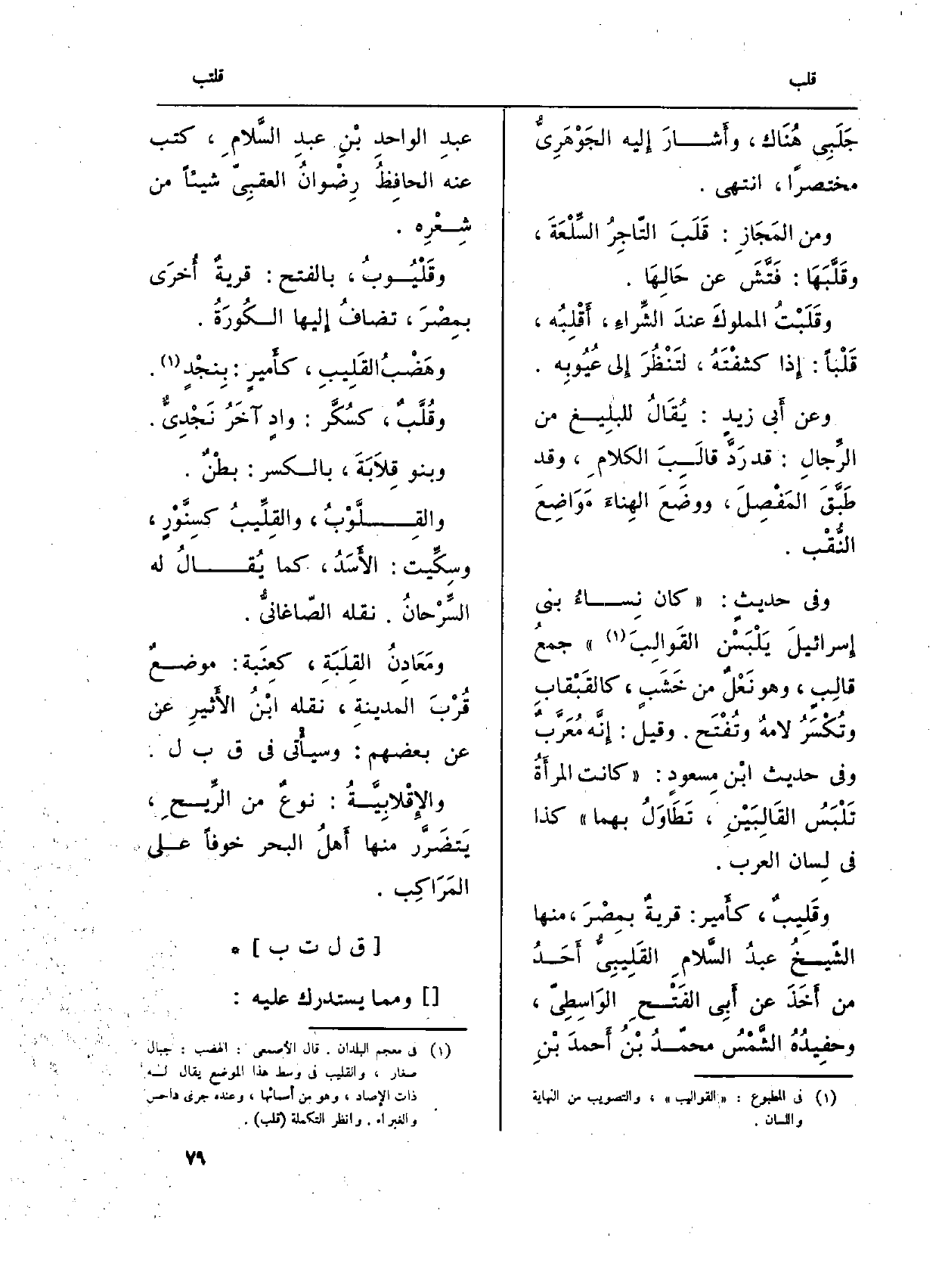 وَفِي حديثٍ: (كَانَ نِساءُ بني إِسرائيلَ يَلْبَسْن القَوالِبَ) جمعُ قالِبٍ، وَهُوَ نَعْلٌ من خَشَبٍ، كالقَبْقابِ وتُكْسَرُ لامهُ وتُفْتَح. وَقيل: إِنَّه مُعَرَّبٌ وَفِي حَدِيث ابْنِ مسعودٍ: (كَانَت المرأَةُ تَلْبَسُ القَالِبَيْنِ، تَطَاوَلُ بهما) كَذَا فِي لِسان الْعَرَب.
