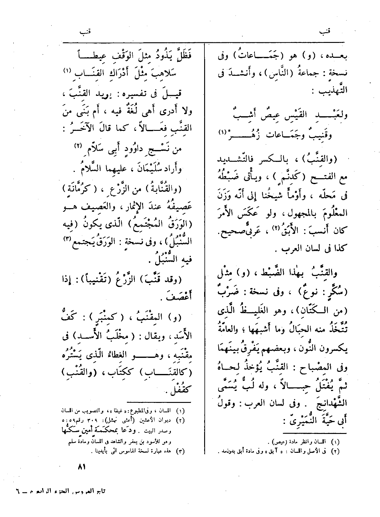 قيلَ فِي تَفْسِيره: يُرِيد القِنَّبَ، وَلَا أَدري أَهي لُغَةٌ فِيهِ، أَم بَنَى منَ القِنَّبِ فِعَالاً، كَمَا قالَ الآخَرُ:
