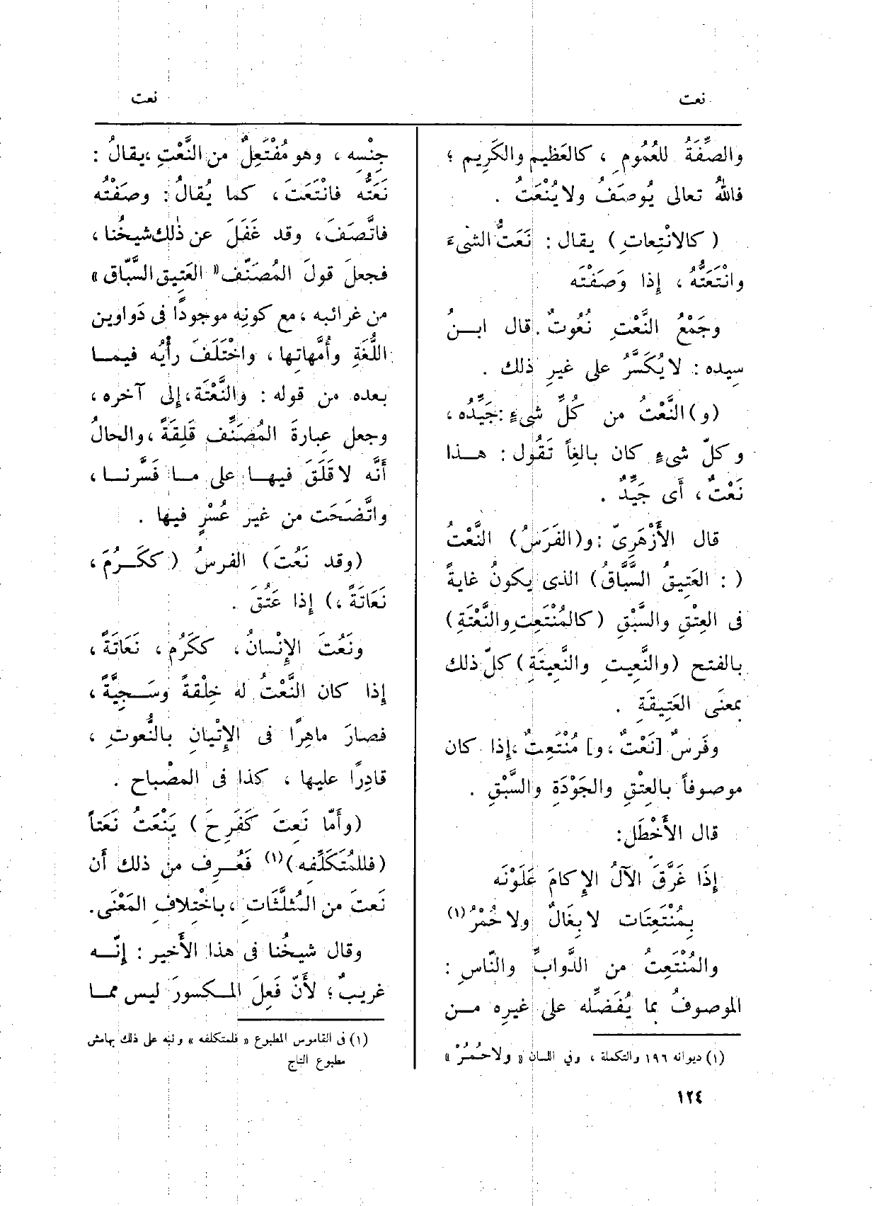 (كالانْتِعاتِ) يُقَال: نَعَتُّ الشيءَ وانْتَعَتُّهُ، إِذا وَصَفْتَه.