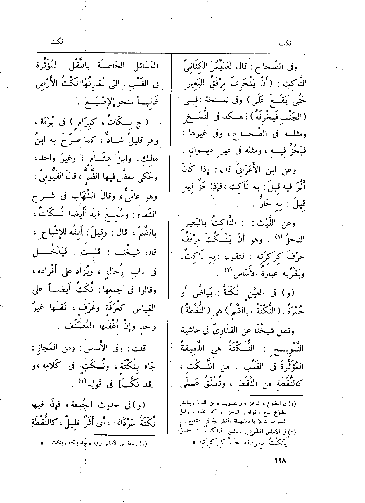 وَعَن اللَّيْث: النَّاكِتُ بالبَعِيرِ الناحزُ، وَهُوَ أَنْ يَنْكُتَ مِرْفَقُه حرْفَ كِرْكِرَتِه، فَتَقول: بهِ نَاكِتٌ. ويَقْرُبه عبارةُ الأَسَاس.