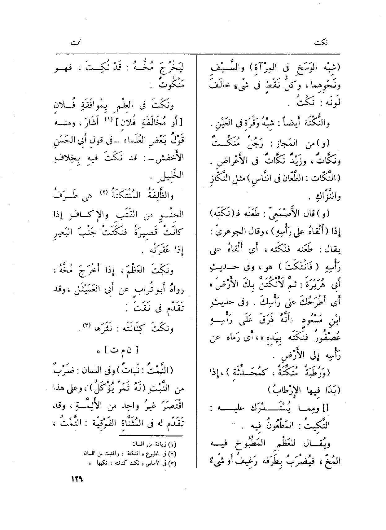 ويُقال للعَظْمه المَطْبُوخ فِيهِ المُخّ، فيُضْرَبُ بِطَرَفِه رَغِيفٌ أَو شَيْءٌ لَيَخْرُجَ مُخُّهُ: قَدْ نُكِتَ، فَهُوَ مَنْكُوتٌ.