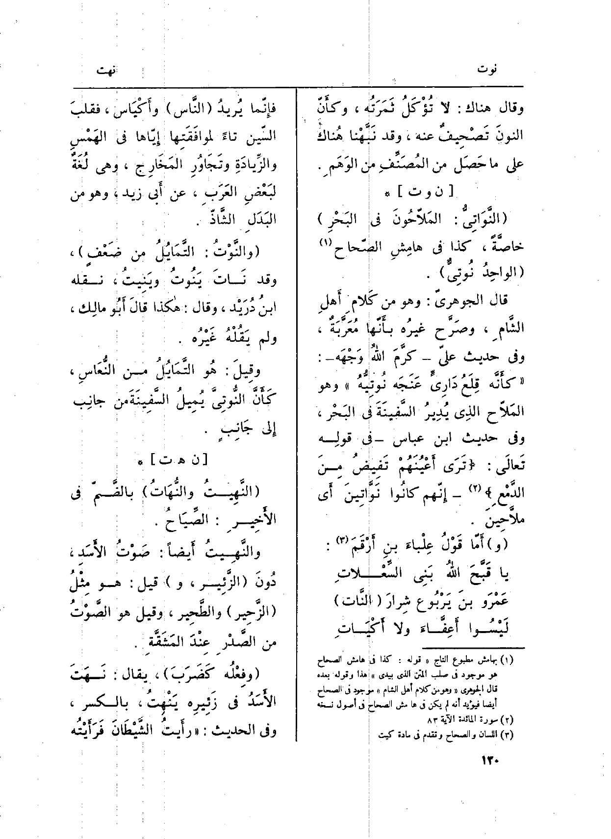 : ( {النَّوَاتِيُّ: المَلاّحُونَ فِي البَحْرِ) خاصَّةً، كَذَا فِي هامِشِ الصّحاح (الواحِدُ} نُوتِيٌّ) .