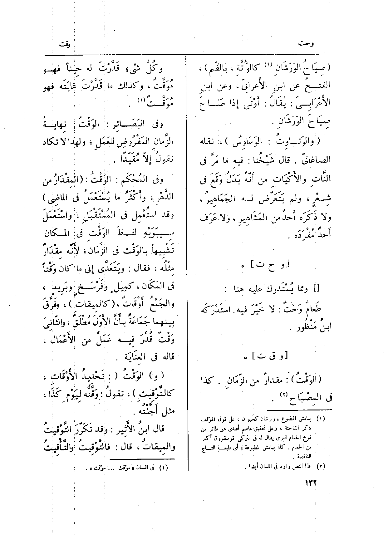 وَفِي البَصَائِر:} الوَقْتُ: نِهايةُ الزَّمانِ المَفْرُوضِ للعَمَلِ؛ وَلِهَذَا لَا تكَاد تقولُ إِلاّ مُقَيّداً.