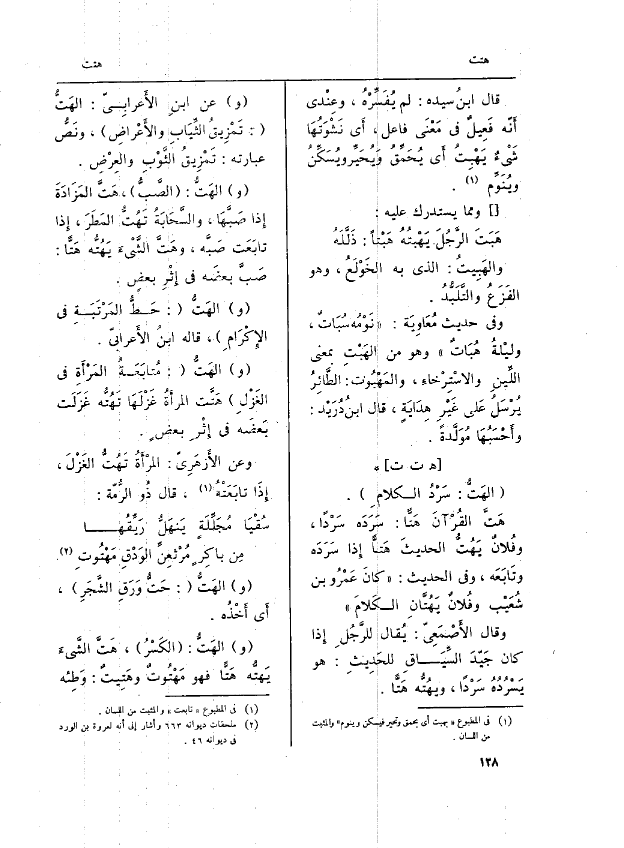 } هَتَّ القُرْآنَ {هَتًّا: سَرَدَه سَرْداً، وفُلانٌ} يَهُتُّ الحديثَ هَتًّا إِذا سَرَدَه وتَابَعَه، وَفِي الحَدِيث: (كانَ عَمْرُو بن شُعْيْب وفُلانٌ {يَهُتَّانِ الكَلامَ) .