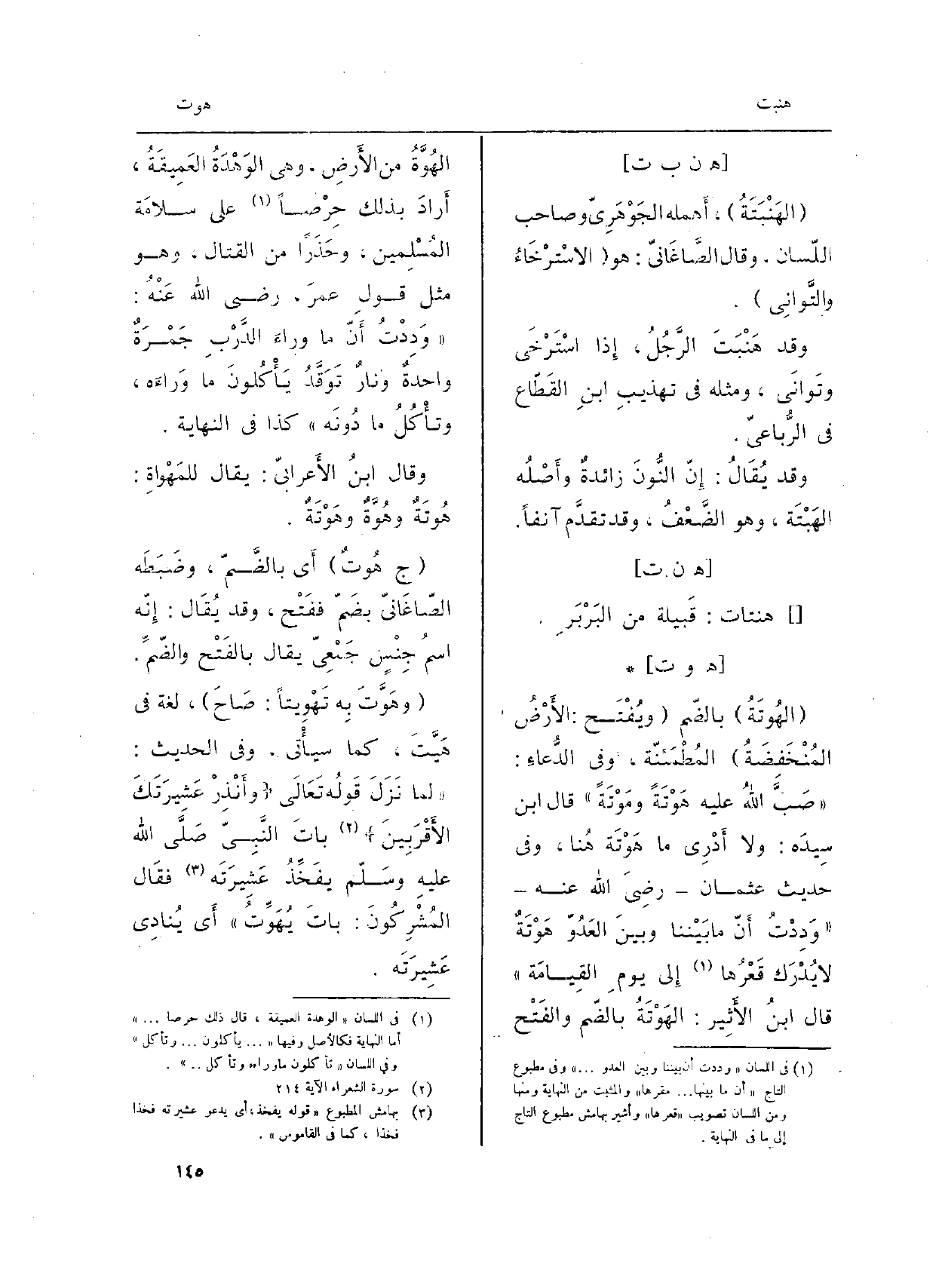 : ( {الهُوتَةُ) بالضّم (ويُفْتَح: الأَرْضُ المُنْخَفِضَةُ) المُطْمَئنّة، وَفِي الدُّعاءِ: (صَبَّ الله عَلَيْهِ} هَوْتَةً ومَوْتَةً) قَالَ ابْن سِيدَه: وَلَا أَدْرِي مَا هَوْتَة هُنا، وَفِي حَدِيث عُثْمَان رضِيَ الله عَنهُ (وَدِدْتُ أَنّ مَا بَيْننا وبينَ العَدُوّ هَوْتَةٌ لَا يُدْرَك قَعْرُها إِلى يومِ القِيامَة) قَالَ ابنُ الأَثِير: الهَوْتَةُ بالضّم والفَتْح الهُوَّةُ من الأَرضِ، وَفِي الوَهْدَةُ العَمِيقَةُ، أَرادَ بذلك حِرْصاً على سلامَة المُسْلِمين، وحَذَراً من الْقِتَال، وَهُوَ مثل قولِ عمرَ، رَضِي الله عَنْهُ: (وَدِدْتُ أَنّ مَا وراءَ الدَّرْبِ جَمْرَةٌ واحدةٌ ونارٌ تَوَقَّدُ يَأْكُلونَ مَا وَراءَه، وتأْكُلُ مَا دُونَه) كَذَا فِي النِّهَايَة.