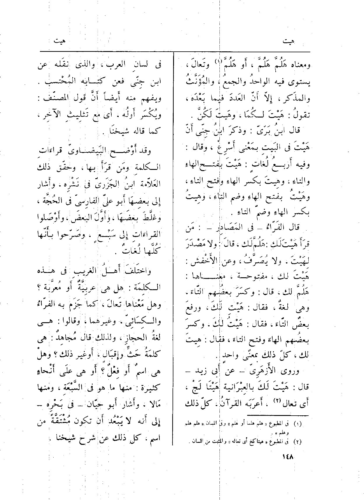 وَمَعْنَاهُ هَلُمَّ هَلُمَّ، أَو هَلُمَّ وتَعالَ، يَسْتَوِي فِيهِ الواحدُ والجمعُ، والمُؤَنَّثُ والمذَكر، إِلاّ أَنّ العَددَ فِيمَا بَعْدَه، تقولُ: هَيْتَ لكُمَا، وهَيتَ لَكُنَّ.