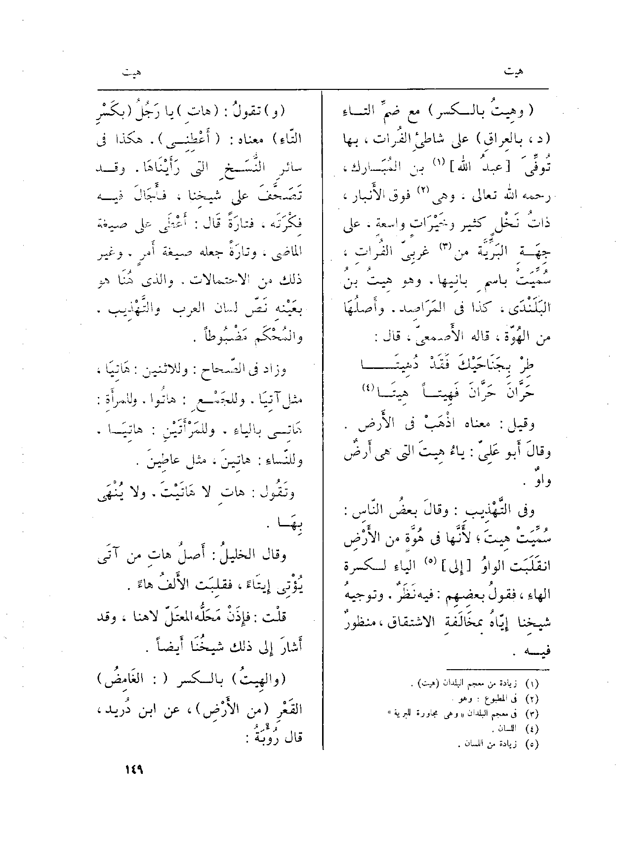 (و) تقولُ: ( {هاتِ) يَا رَجلُ (بكَسْرِ التّاءِ) مَعْنَاهُ: (أَعْطِنِي) ، هَكَذَا فِي سائرِ النُّسَخِ الَّتِي رَأَيْنَاهَا، وَقد تَصَحَّفَ على شيخِنا، فأَجَالَ فِيهِ فِكْرَتَه، فتارَةً قَال: أَعْطَى على صِيغَة الْمَاضِي، وتارَةً جعله صِيغَة أَمرٍ، وَغير بعَيْنهِ نَصّ لِسَان الْعَرَب والتَّهْذِيب، والمُحْكَم مَضْبُوطاً.