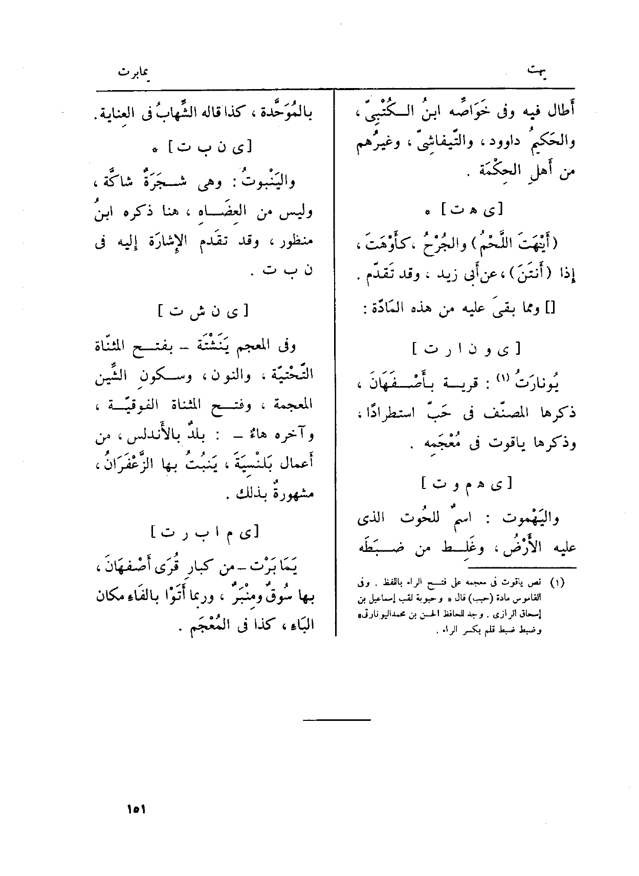 : وَفِي المعجم يَنَشْتَة بِفَتْح المثنّة التّحْتيّة، وَالنُّون، وسكونِ الشِّين الْمُعْجَمَة، وَفتح الْمُثَنَّاة الفوقيّة، وَآخره هاءٌ: بلدٌ بالأَندلس، من أَعمال بَلنْسِيَةَ، يَنبُتُ بهاذ الزَّعْفَرَانُ، مشهورةٌ بذلك.