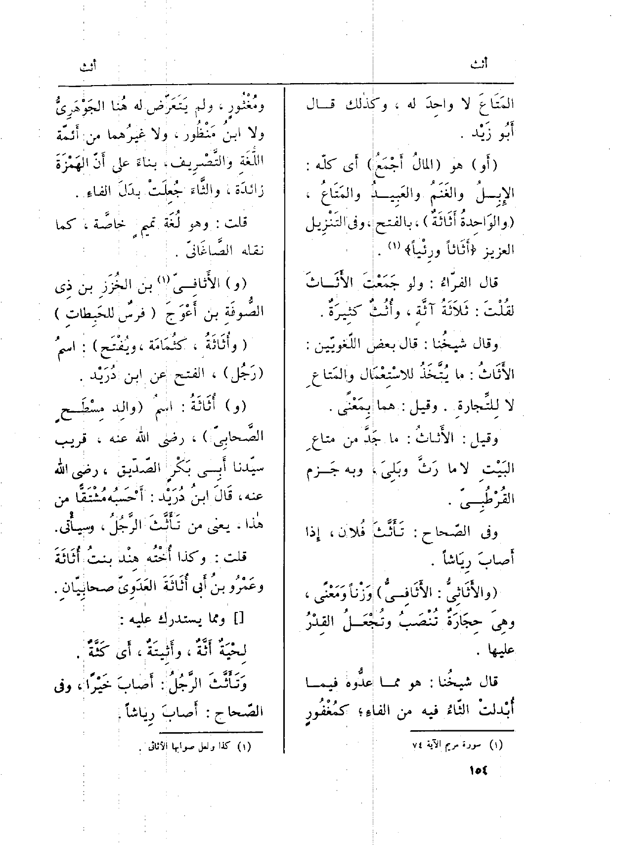 قَالَ الفرّاءُ: وَلَو جَمَعْتَ {الأَثَاثَ لقُلْتَ: ثَلاَثَةُ} آثَّةٍ، {وأُثُثٌ كثِيرَةٌ.