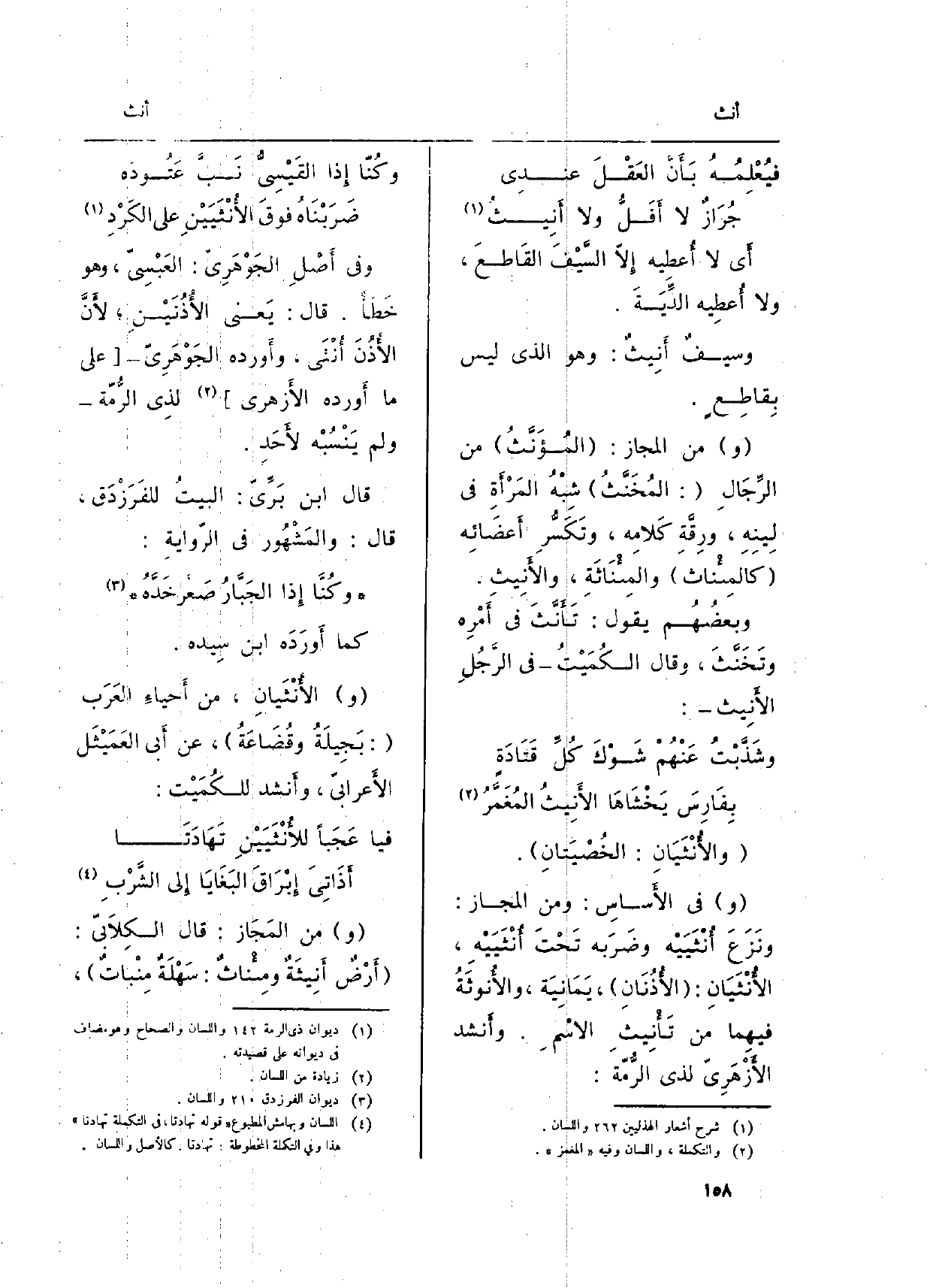 وبعضُهُم يَقُول:} تَأَنَّثَ فِي أَمْرِه وتَخَنَّثَ، وَقَالَ الكُمَيْتُ فِي الرَّجُلِ {الأَنِيث: